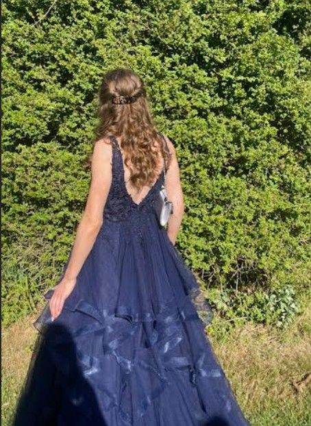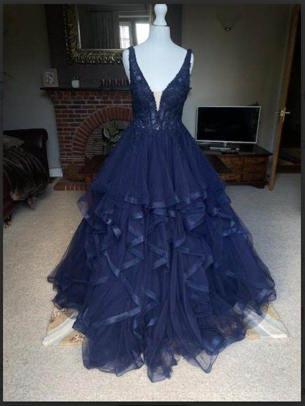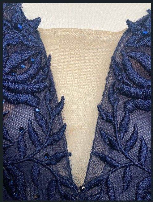Tiffany size 2 (approx UK size 6, EU size 32-34). Embroidered and beaded bodice with a zip-up back. In excellent overall condition. One tiny repair on the bottom layer of the flesh coloured V-shaped fabric on breast bone which is barely noticeable (see photo 4). Smoke-free home.