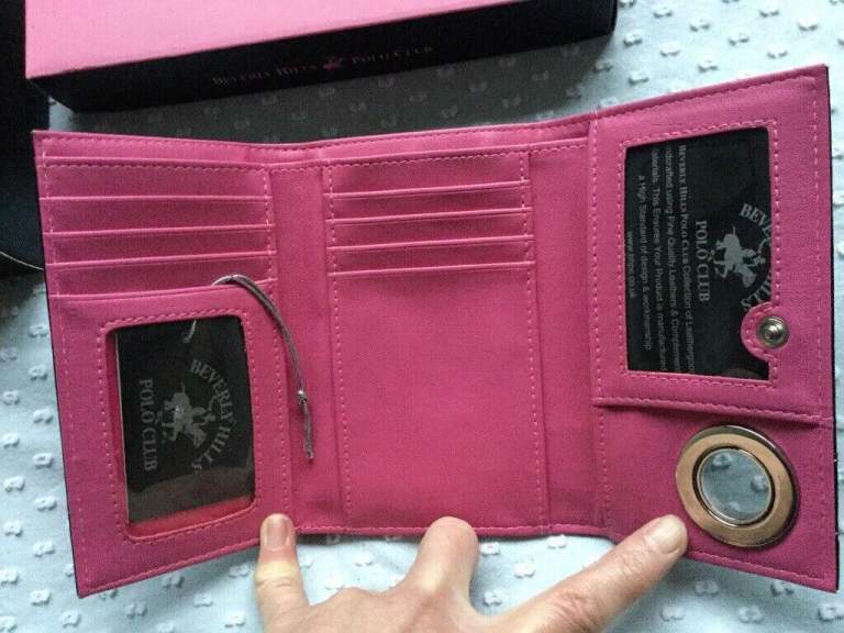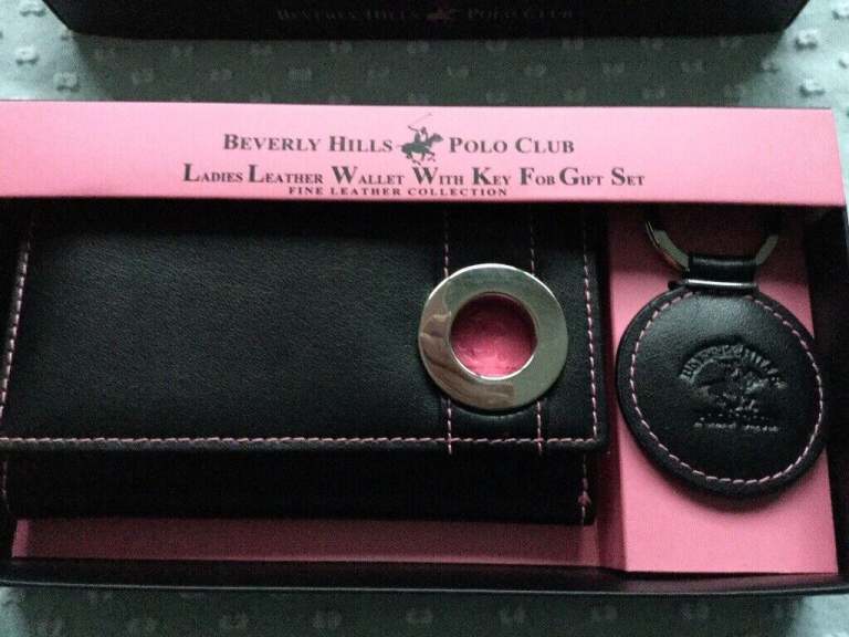 Brand new in box, gift set from Beverly Hills Polo club. ladies leather purse and key fob. Black with pink stitch detailing. Payment on collection only please