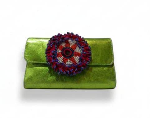 A sophisticated soft leather flapover note, card, and coin case, expertly designed with multiple sections for seamless organization. Secured by a sleek tab closure, this accessory exudes elegance with its refined metal logo embellishment adorning the front.