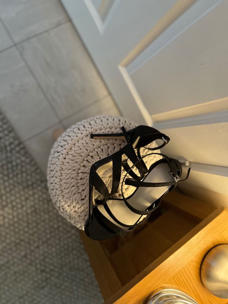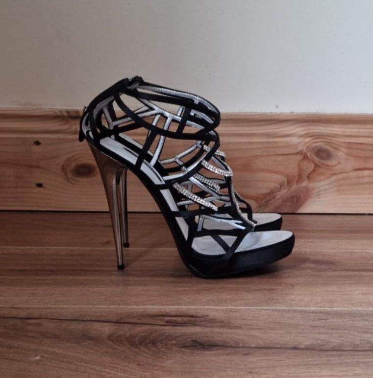 With a high stiletto heel and strappy design, they add a touch of glamour and elegance. The black patent leather upper material and sparkle design.