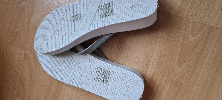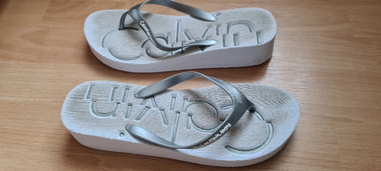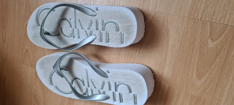 Unisex Calvin Klein Flip Flops in white with silver Grey straps. Size 6 (39). Worn only a couple times in perfect condition.