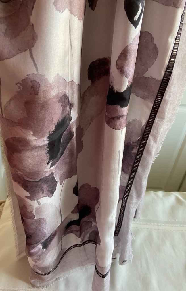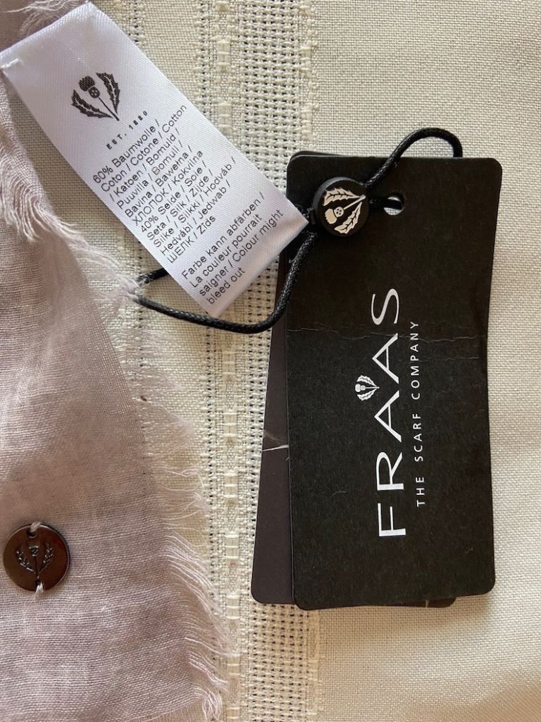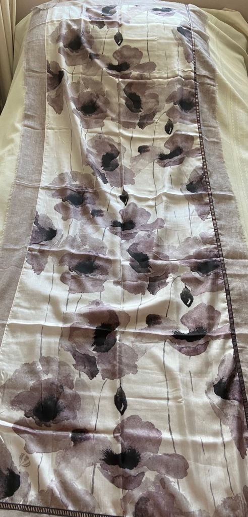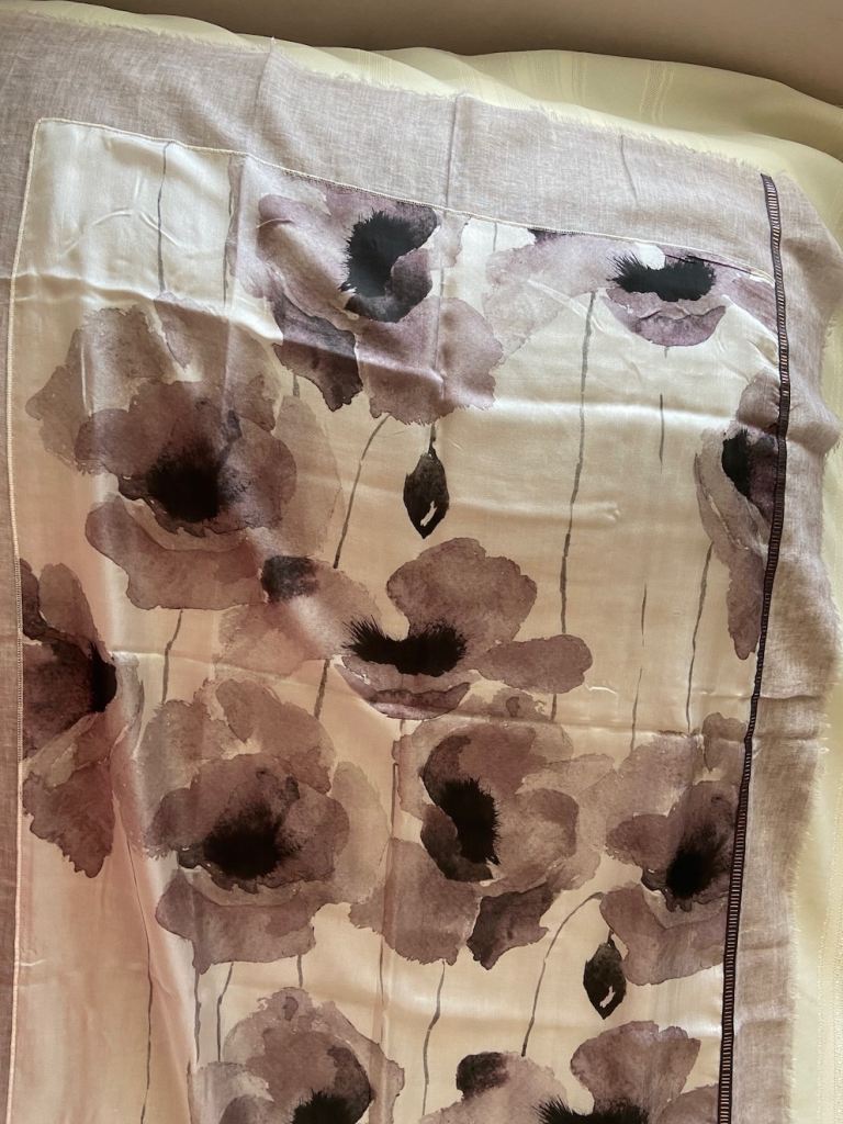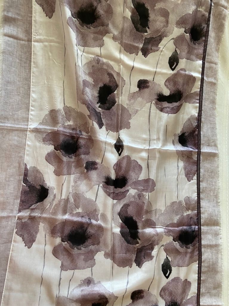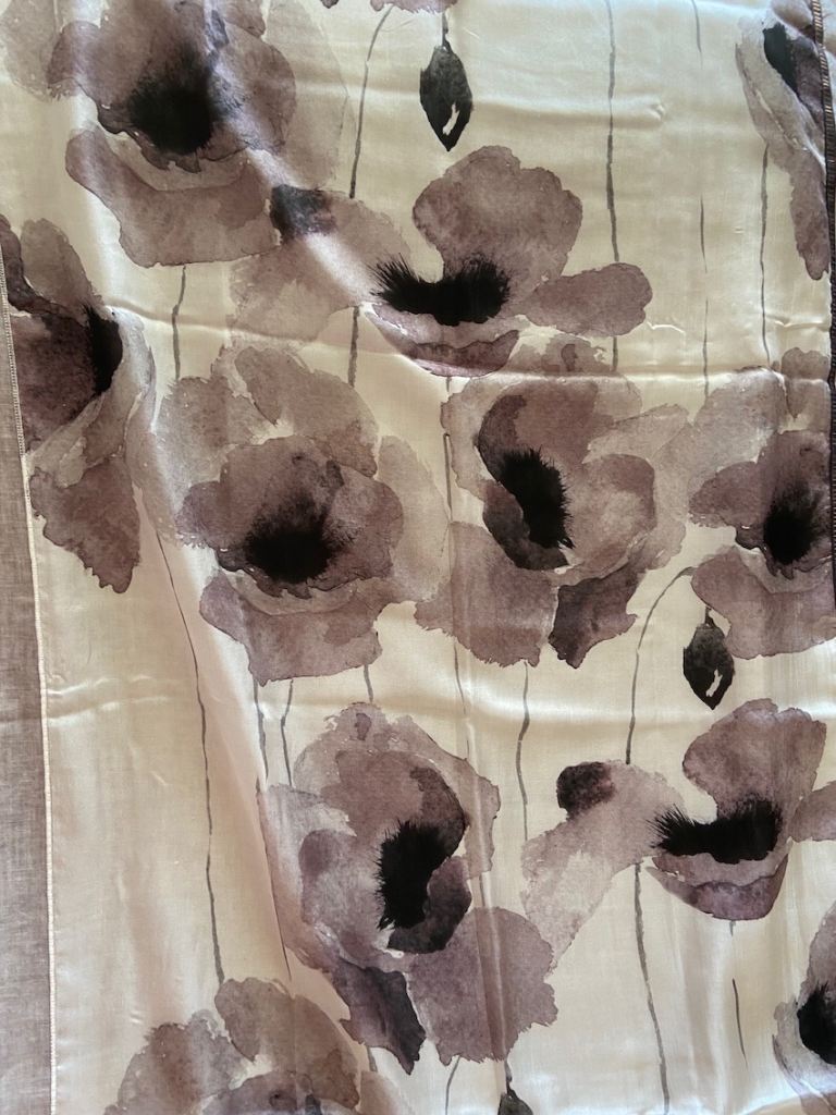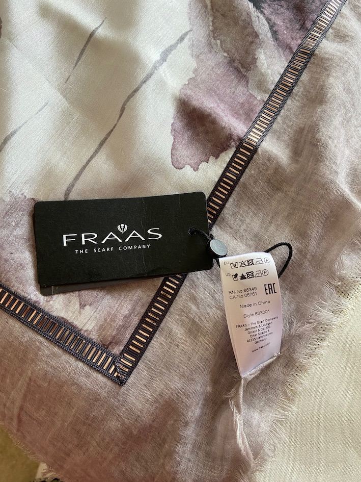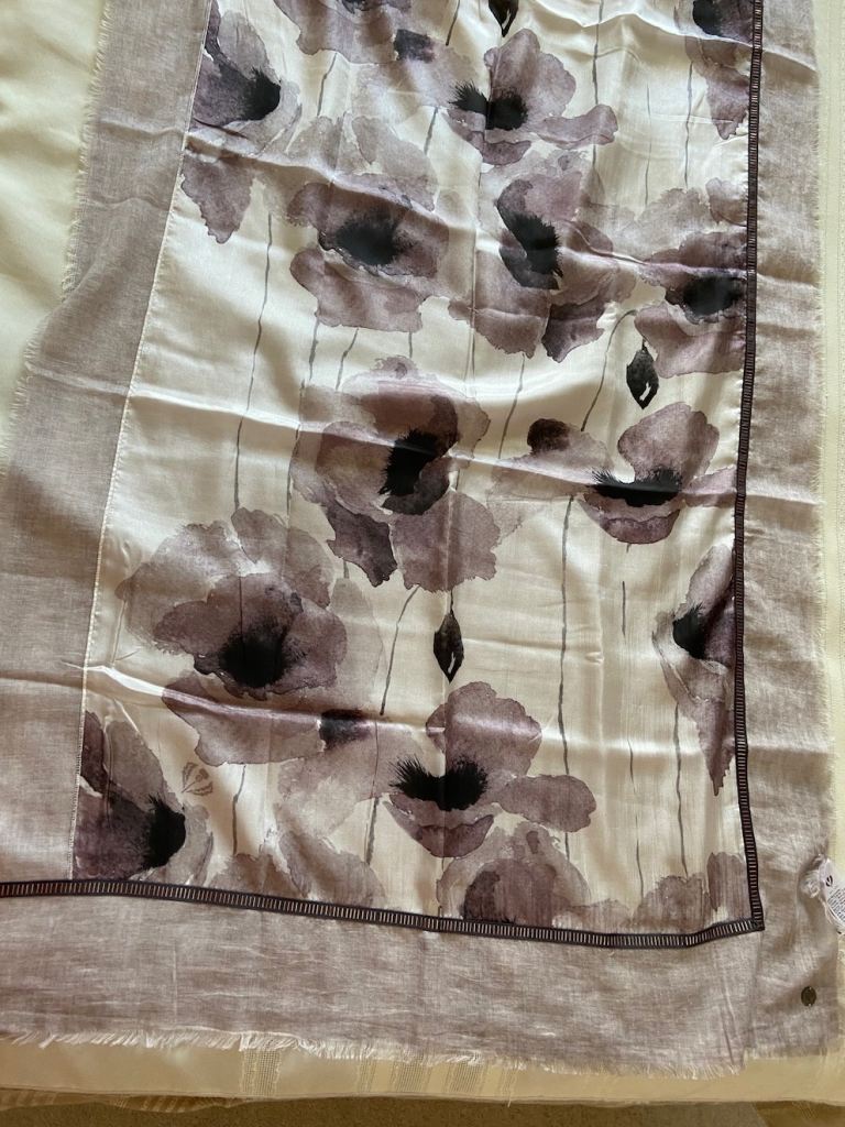 New Fraas Silk-Cotton Scarf, floral design in soft greys, taupe, white