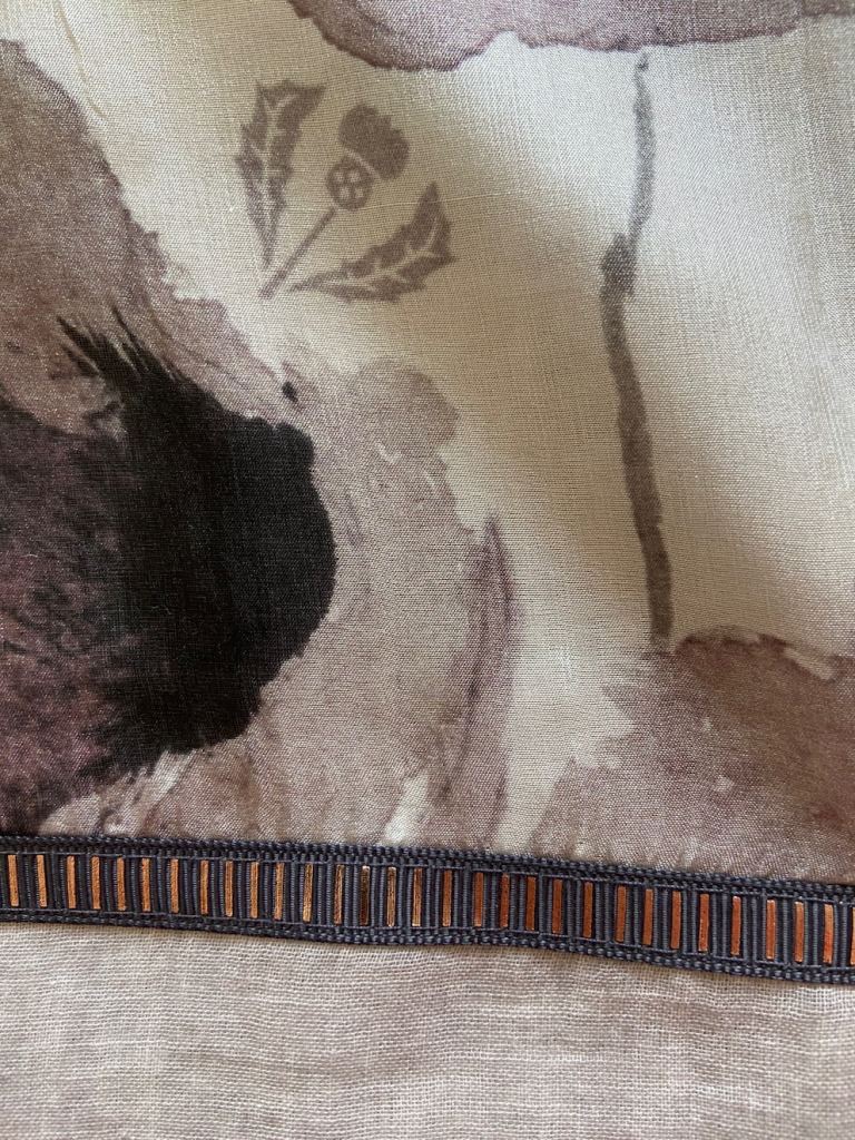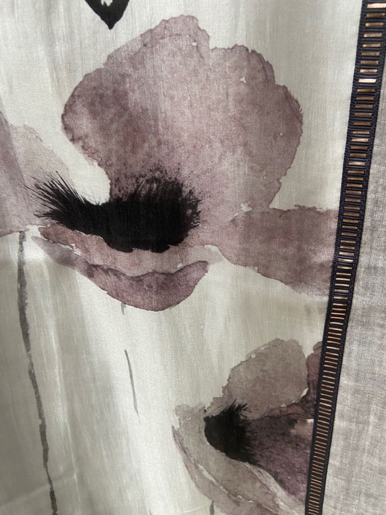 Floral design, resembles poppies, in soft greys with purple hues as well as taupe.