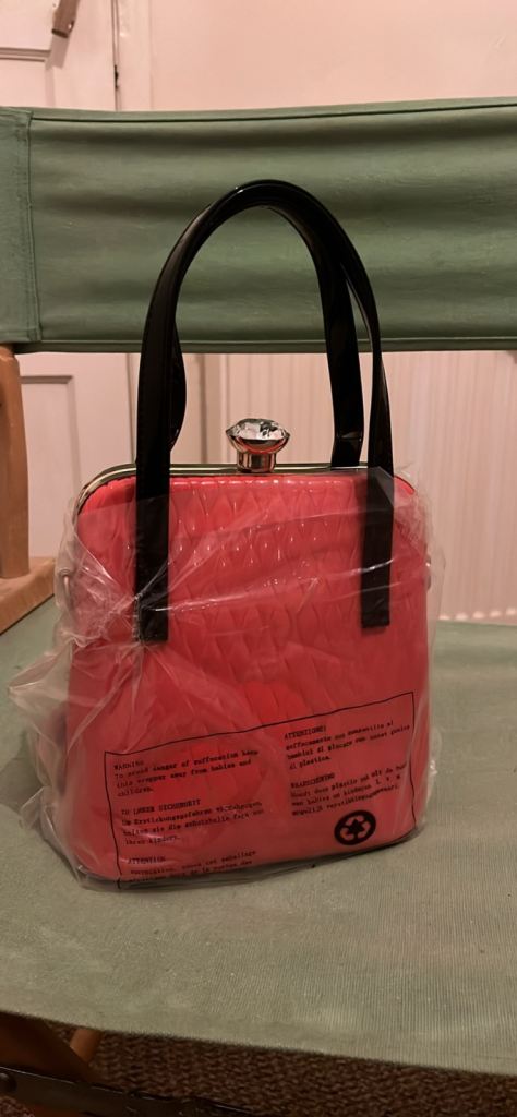 black handles and a clasp that appears to be embellished with a clear bead. It is often referred to as a "grab bag" and is noted for its "Hollywood style classic" and "old school snap-clasp fastening," which are reminiscent of bags from the 1950s. The surface of the bag has a quilted or textured pattern. Can deliver
