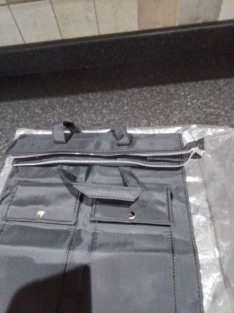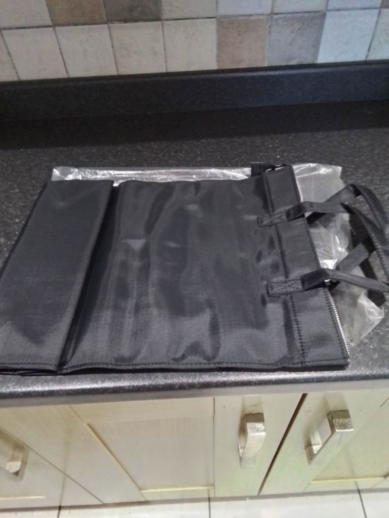 New medium-sized soft foldable black shopping bag with four compartments. Lovley material. 16x13x4 1/2 inches. I think it is nylon?