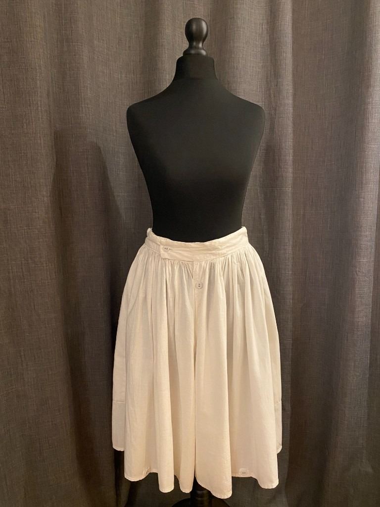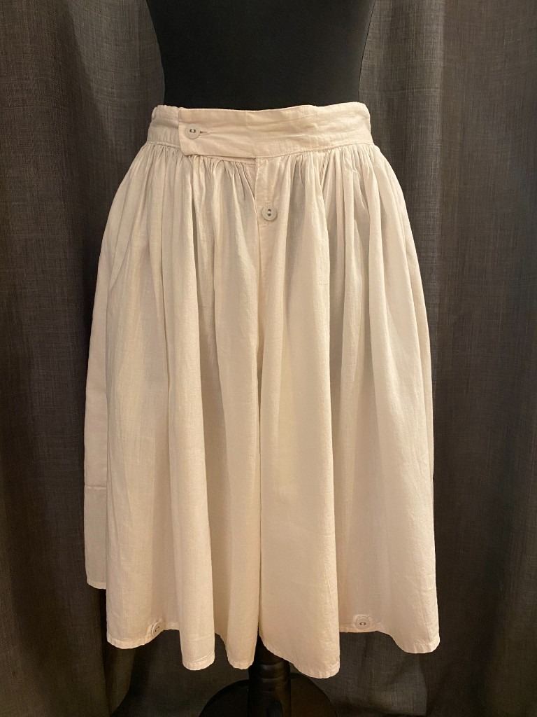 A button and loop on the lower hem adjusts leg width. The waist has a button fastening and a drawstring.