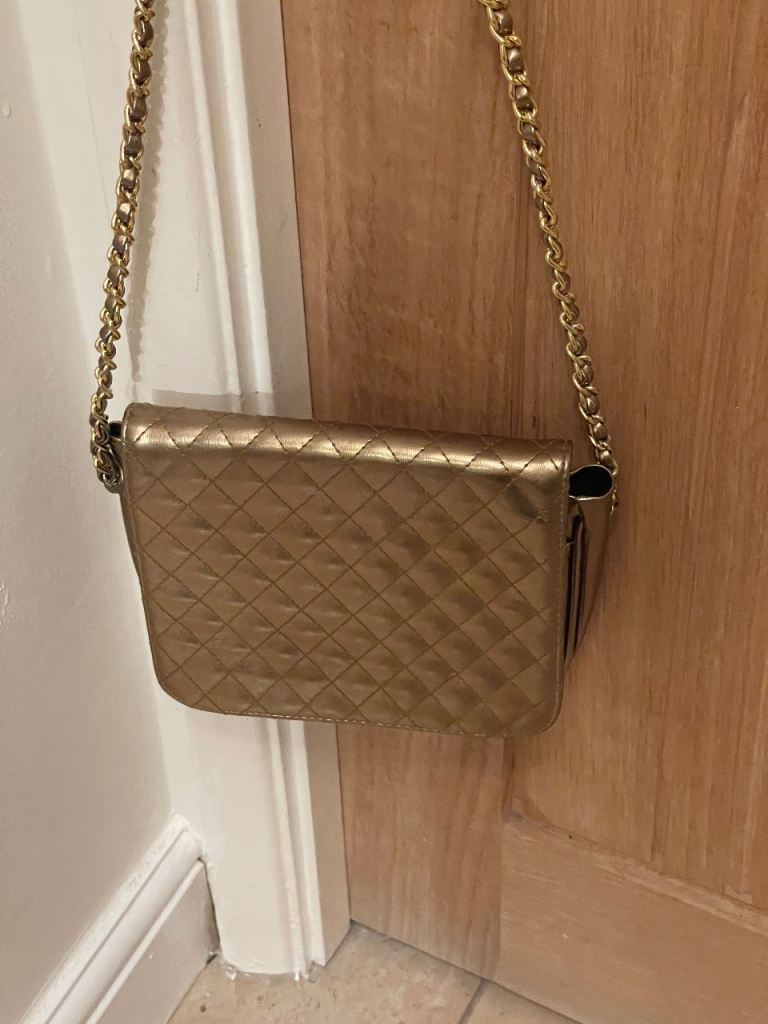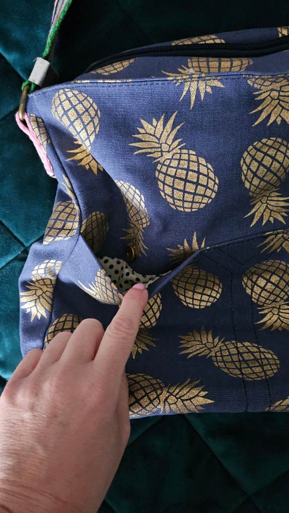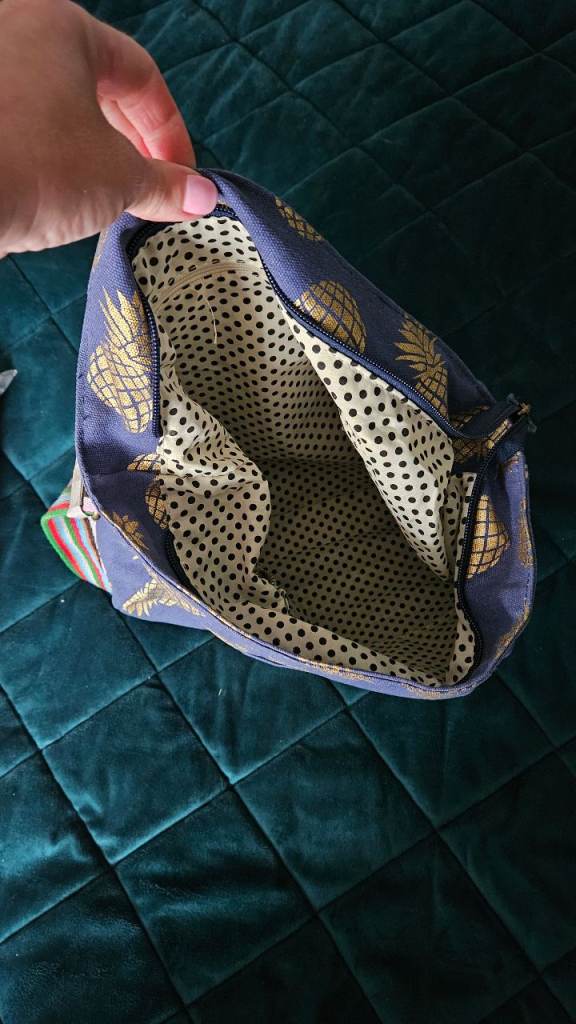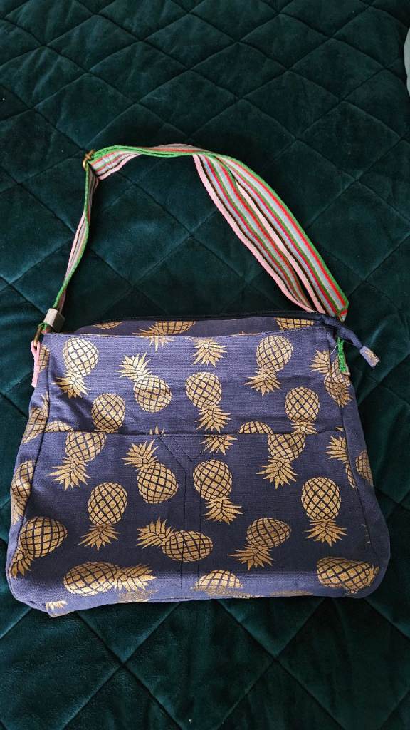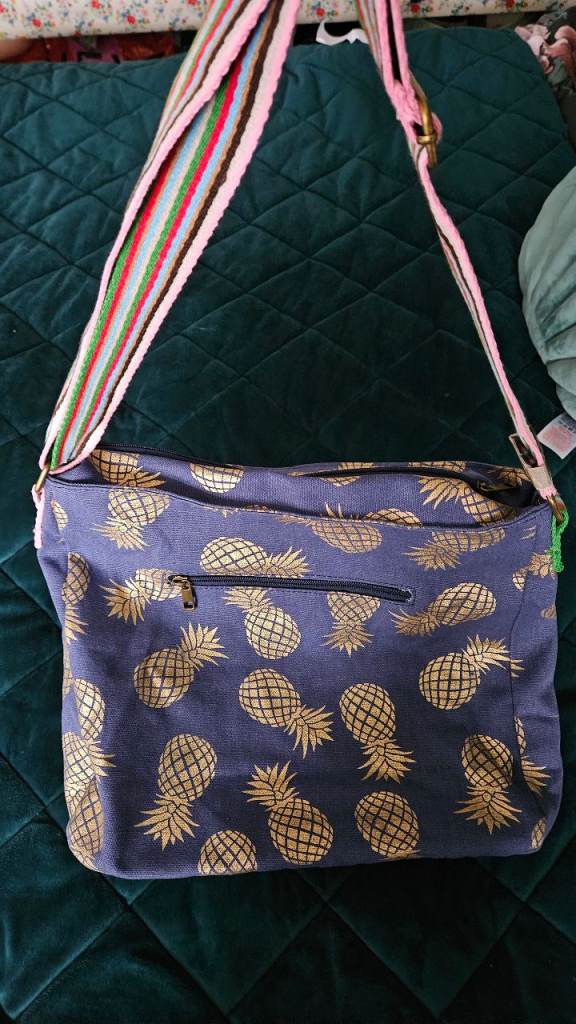 Really roomy bag, can fit lots in. Also has several sections and compartments within the bag. Colours are fab. Navy and gold and a white and black dot lining. Cute pineapple design. With a multi colour chunky and long strap. Brand new without tags. Never used.