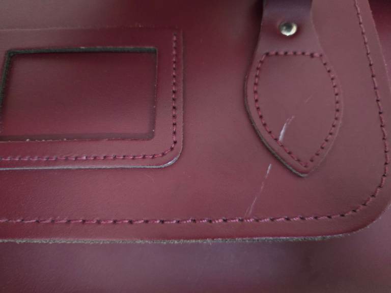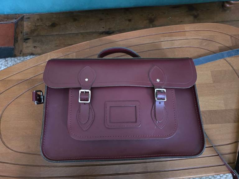 Cambridge Satchel Company 15 inch Batchel in oxblood. 100% leather. Detachable and adjustable shoulder strap. Nickle hardware. Small white mark, which is covered by fastening as pictured. Only used once or twice.