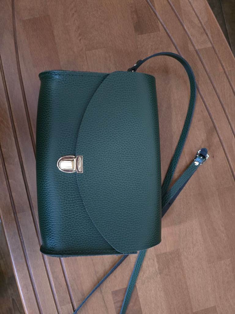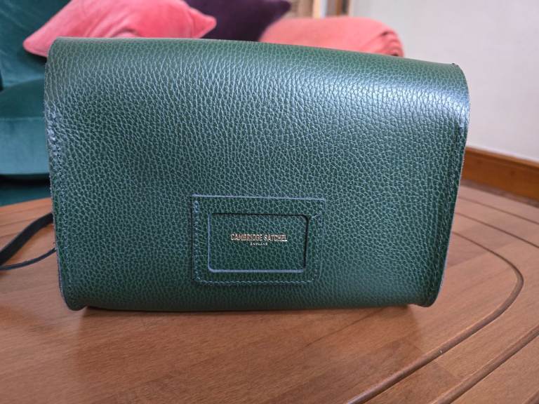 Pushlock buckle cross body bag in racing green. Pale gold hardware, adjustable and detachable shoulder strap. Leather. RRP £125