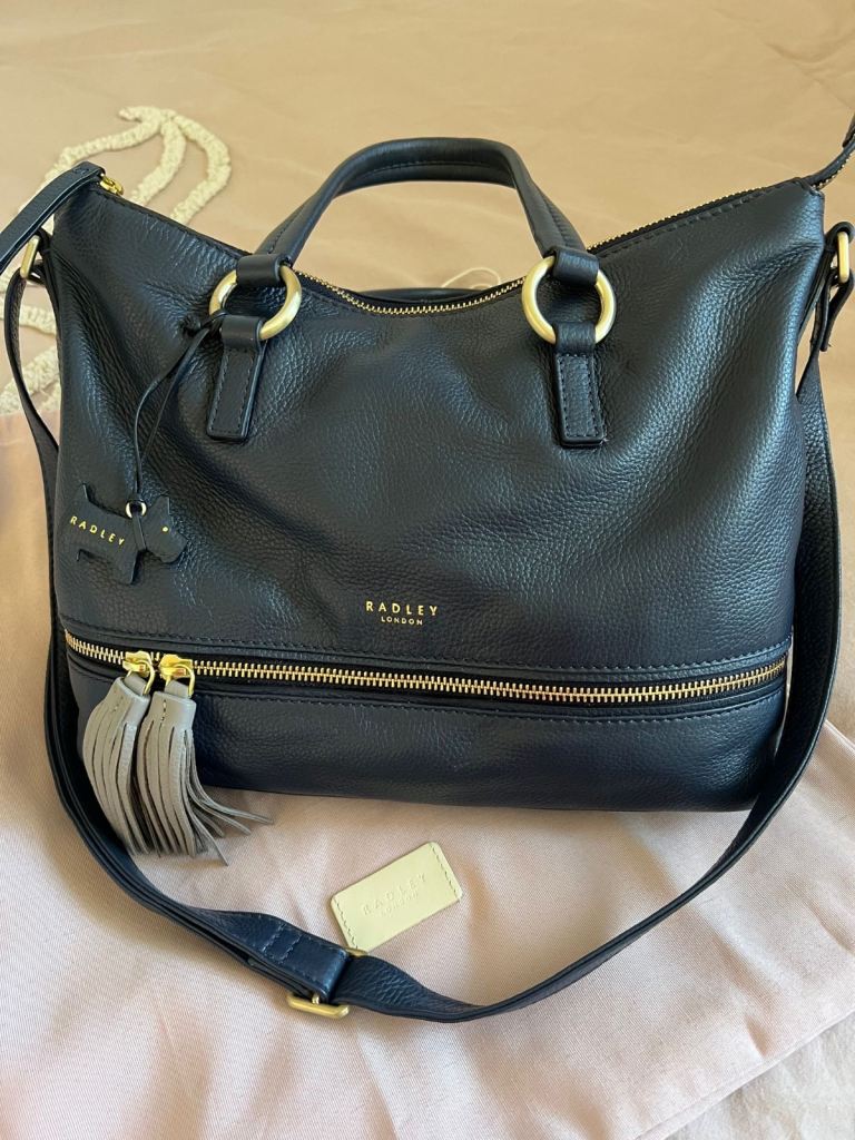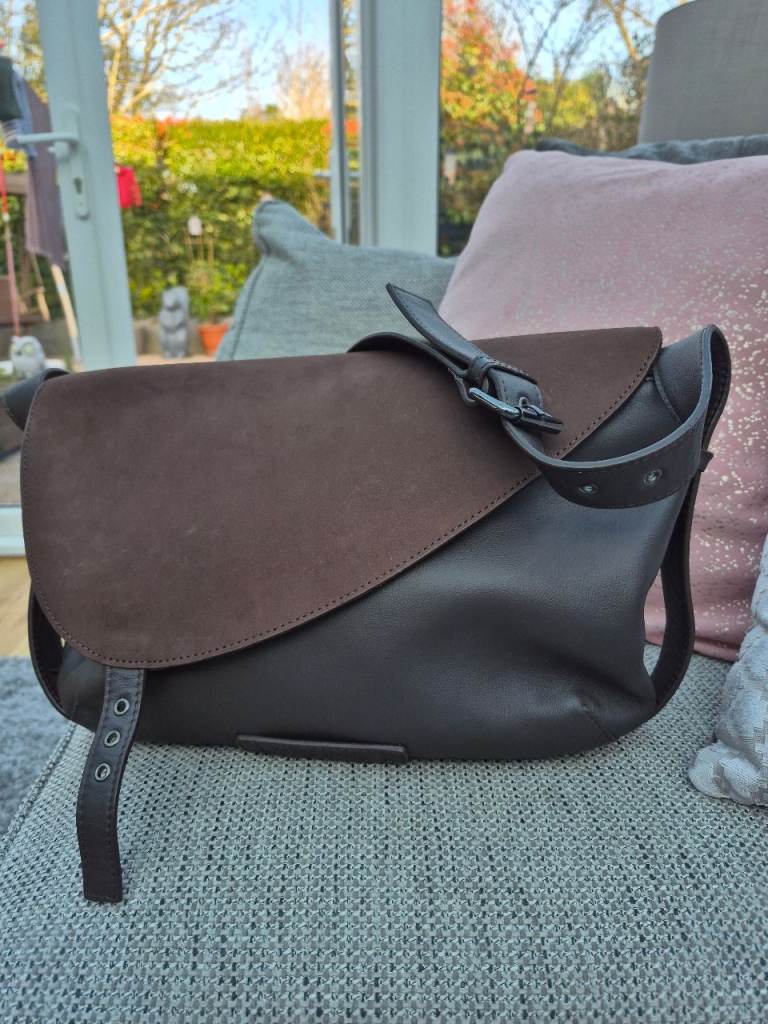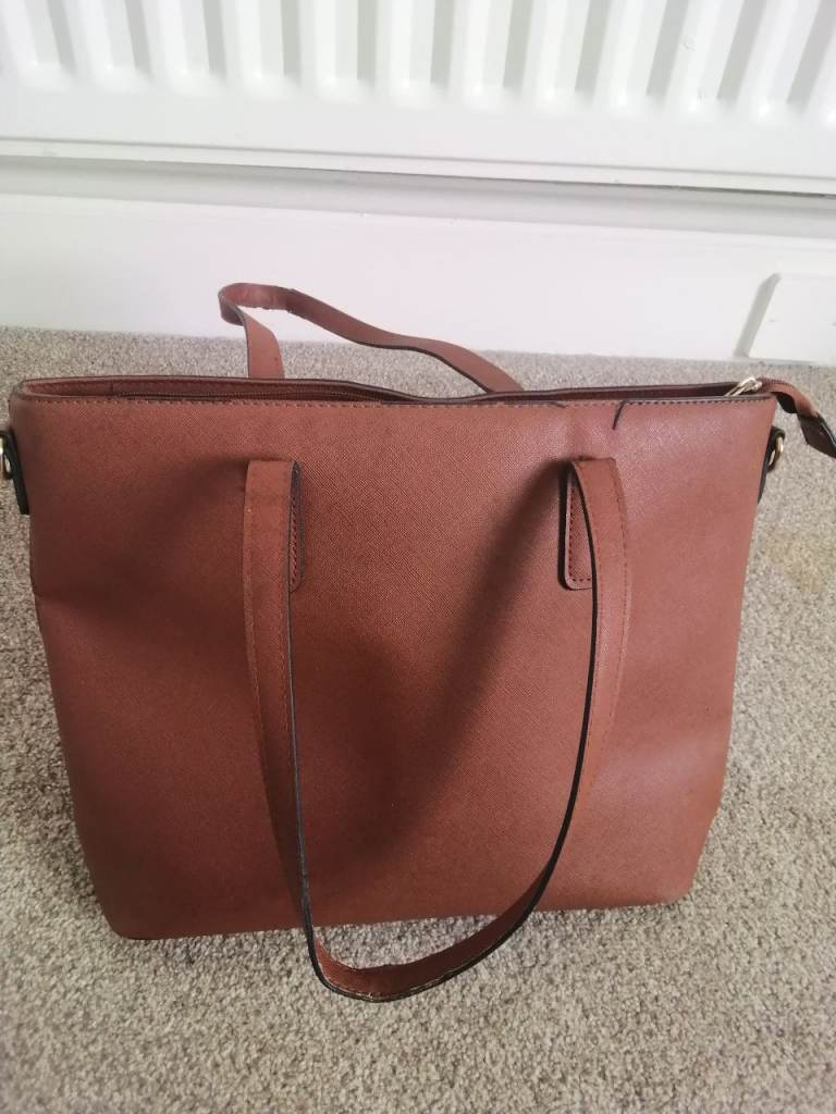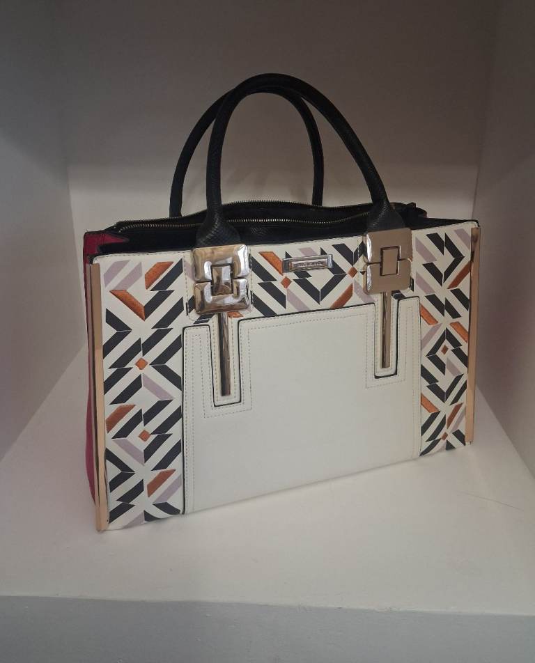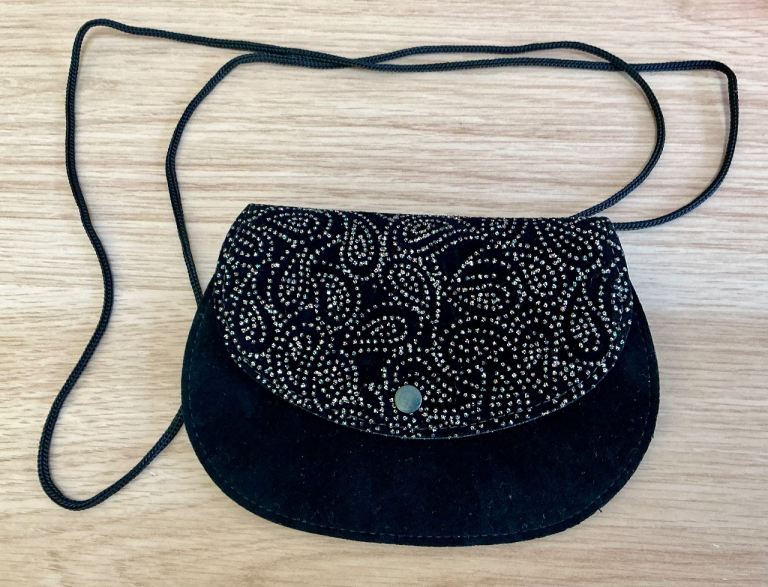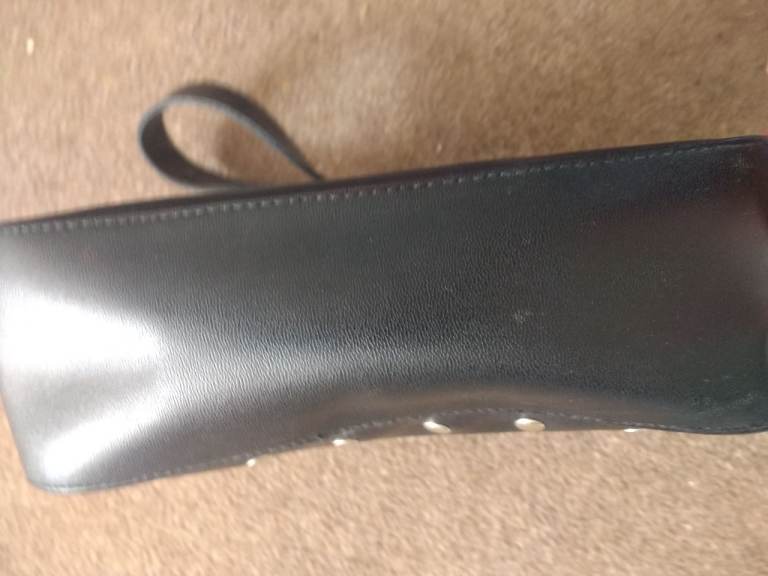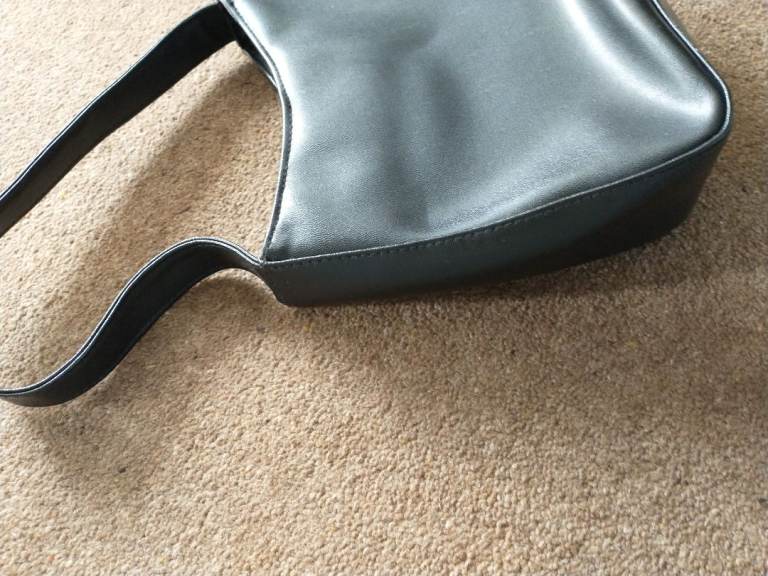 SMALL HANDBAG THAT CAN ALSO BE SLIPPED ONTO SHOUDER TOO. Zipped interior side pocket. Large solid metal clasp to close. 7ins Height, 8ins. width at top widening slightly to 9ins. at bottom. VGC.