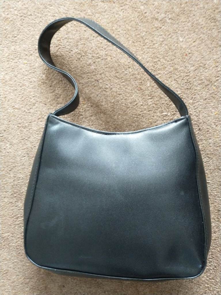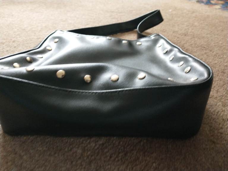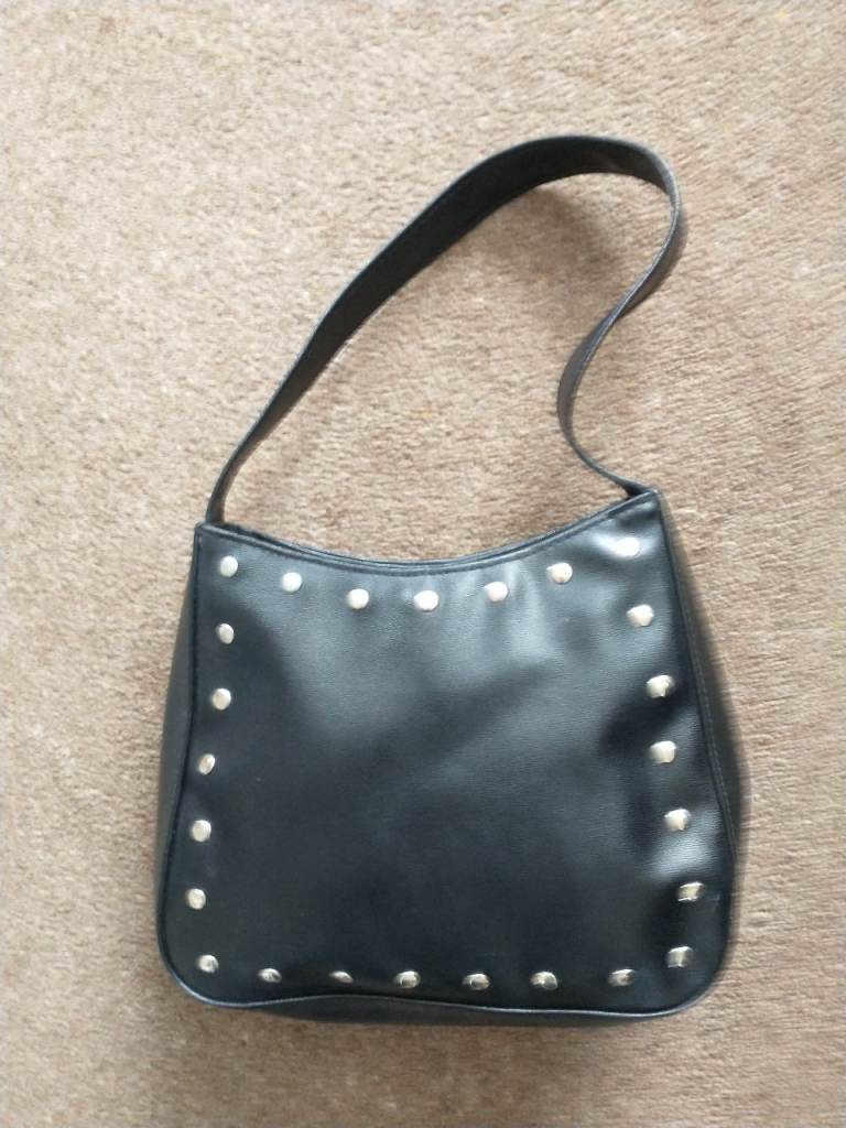 HAND/SHOULDER BAG - small, black, faux-leather, metal studded bag. VGC.