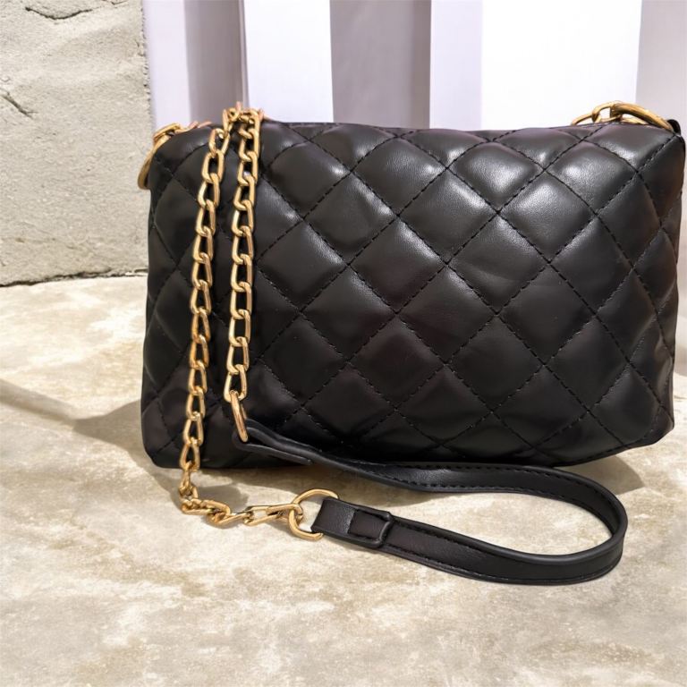 New Black Quilted Faux Leather Shoulder Bag with Gold Chain
