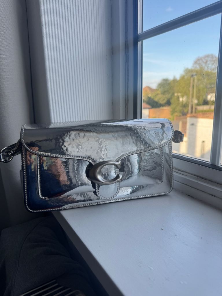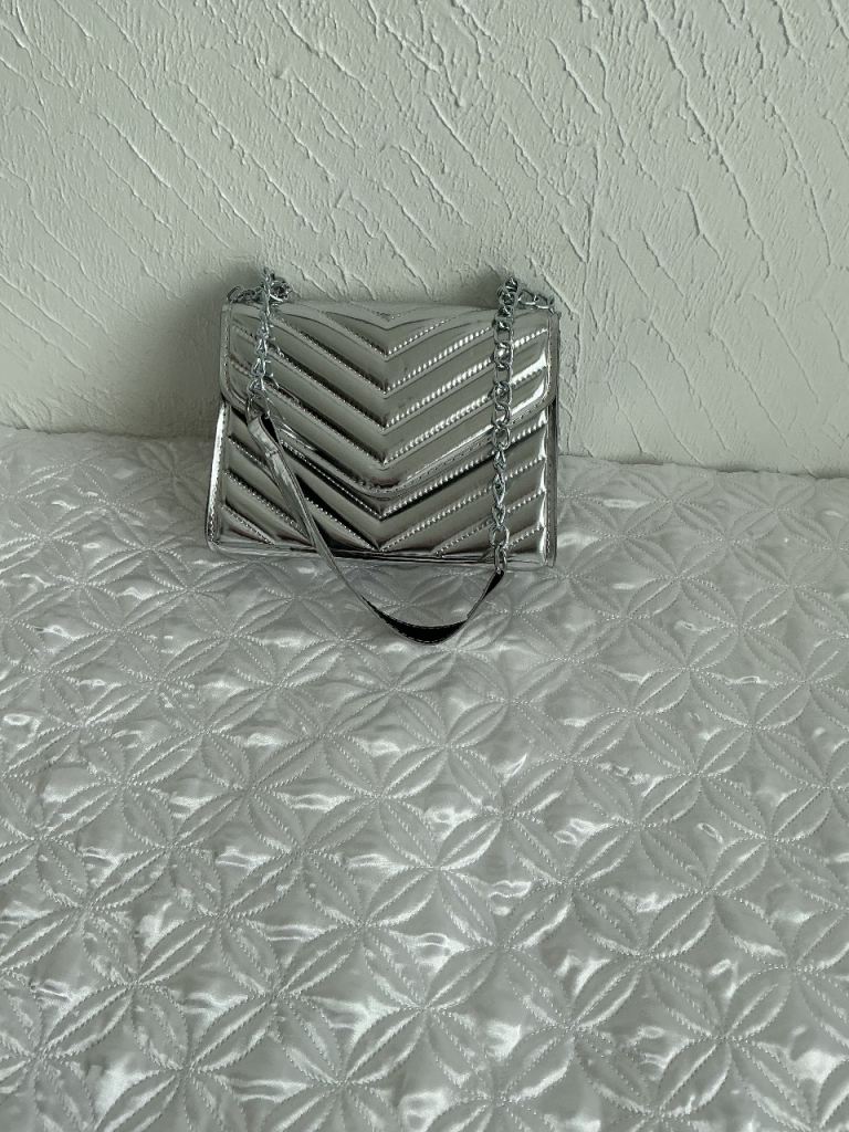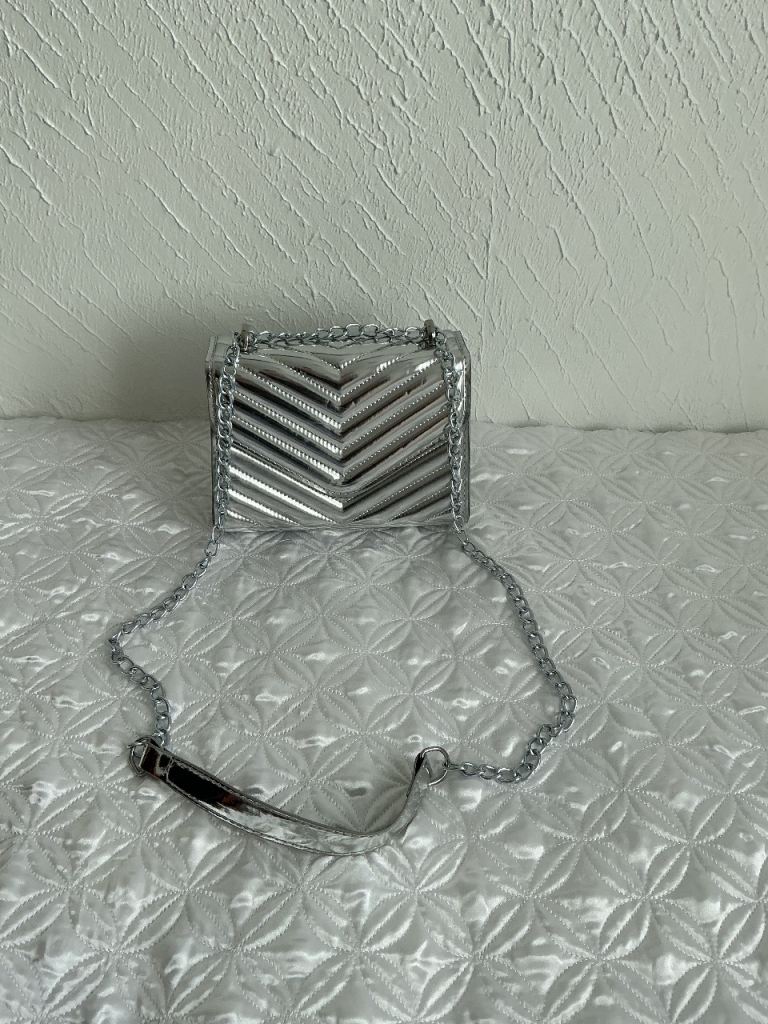 Silver hand or shoulder bag with part chain strap £3.00.