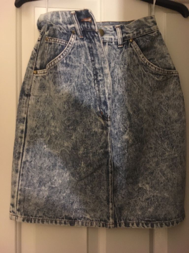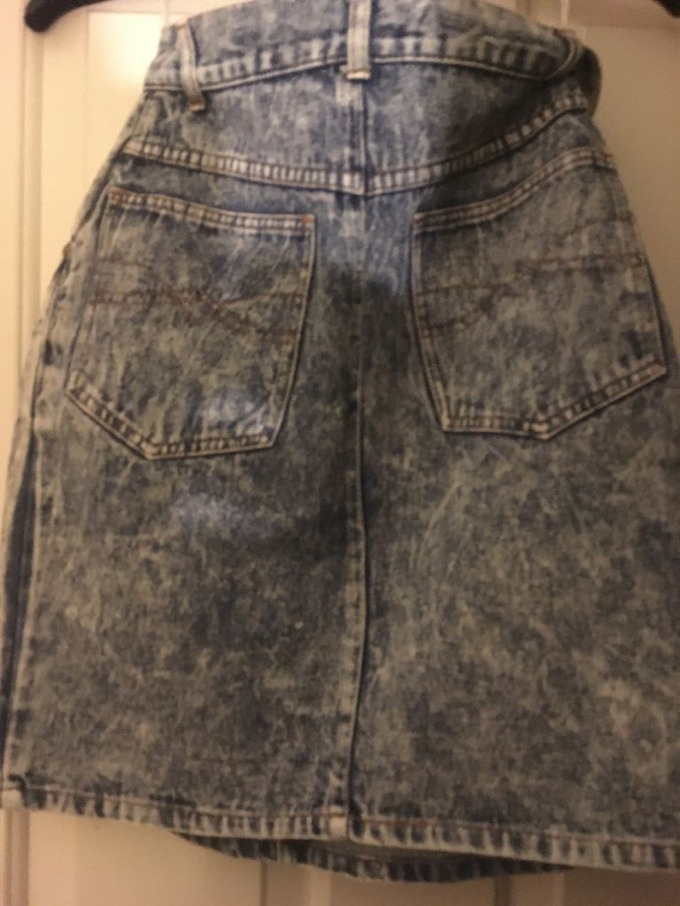 Used faded denim skirt with 4 pockets and front fastening zip in size 10. Collection from IP327GX. £6.00.