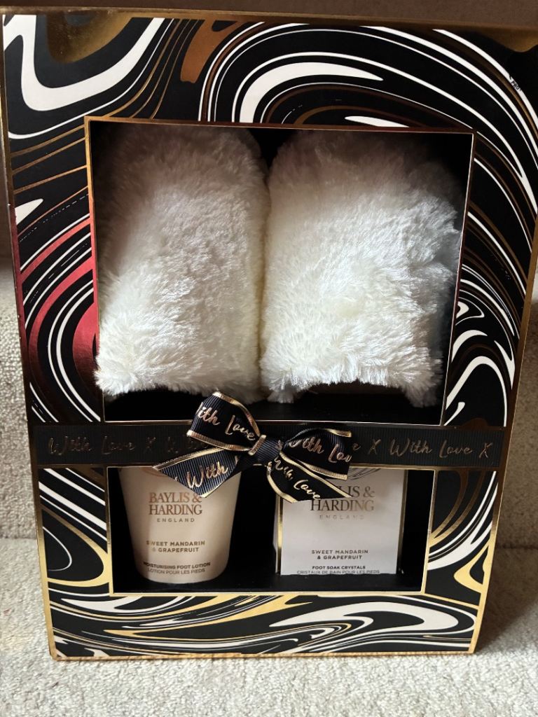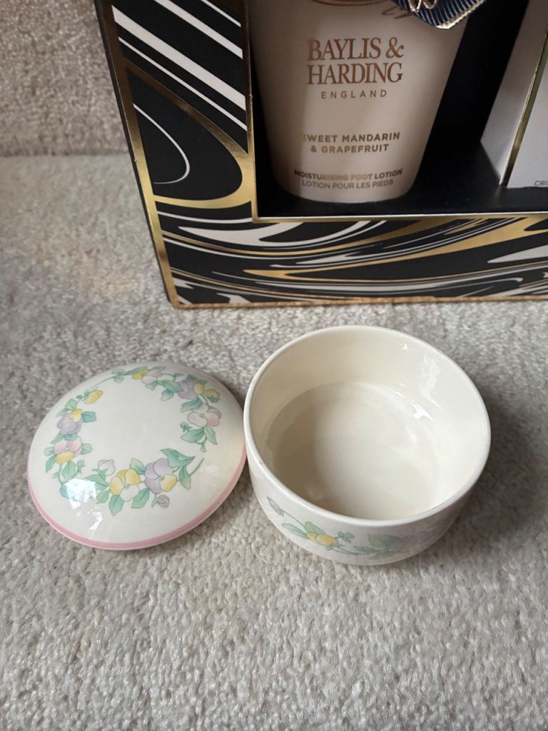 Baylis & Harding slippers/foot lotion and soak, Royal Worcester trinket dish and candle