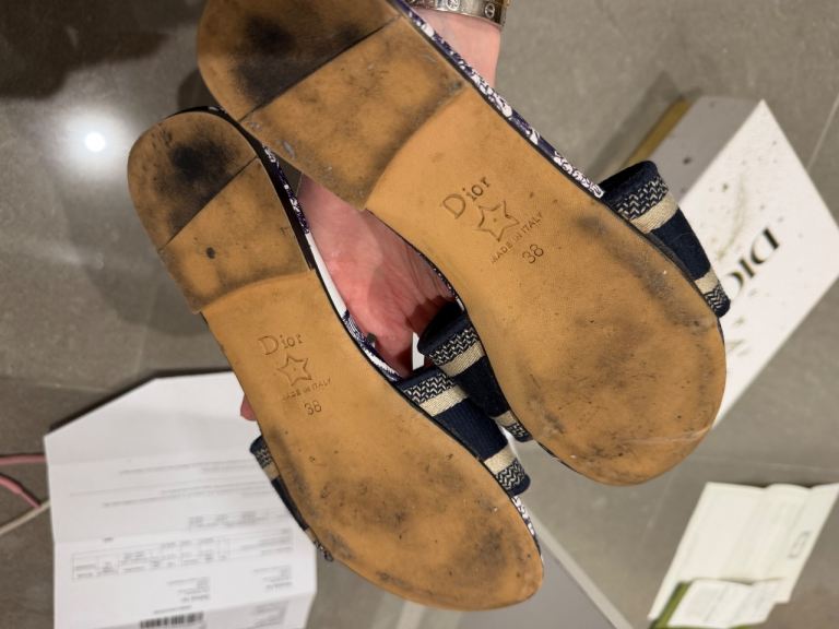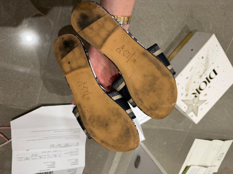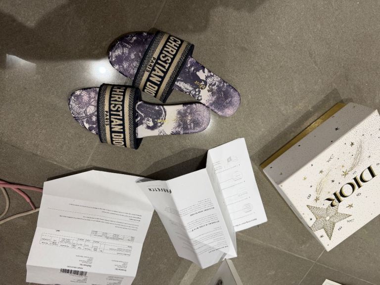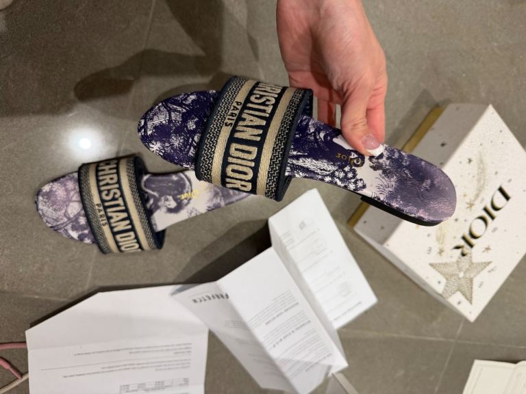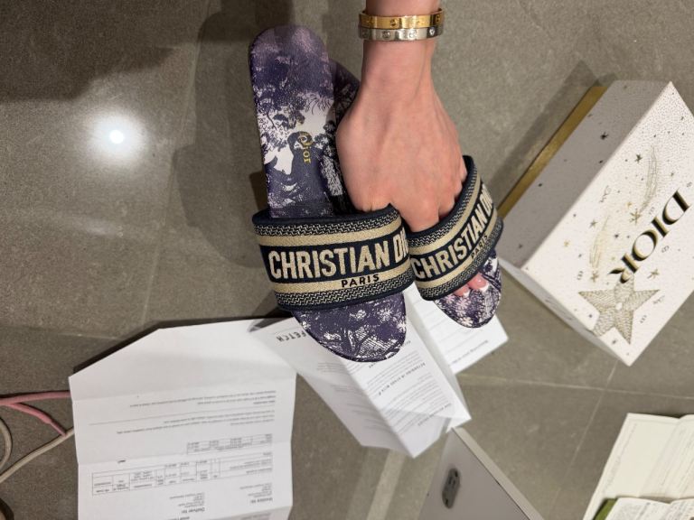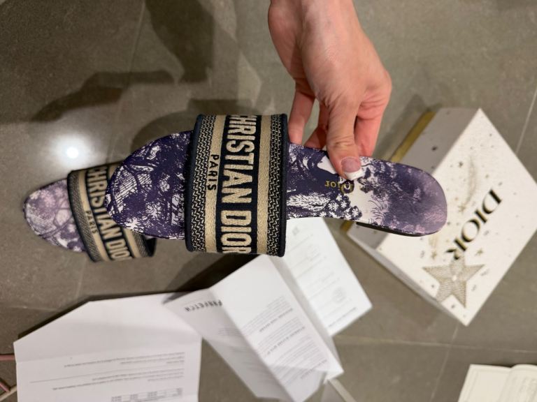 Authentic Christian Dior slide sandals featuring the iconic navy toile print and embroidered “Christian Dior Paris” strap.
