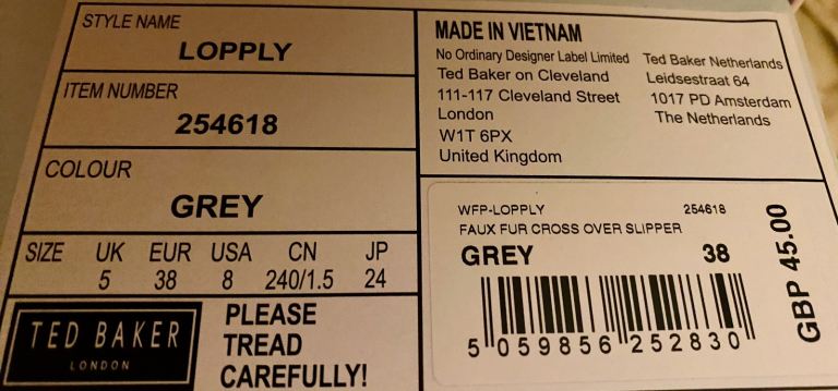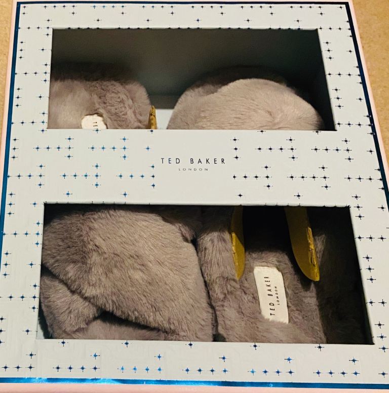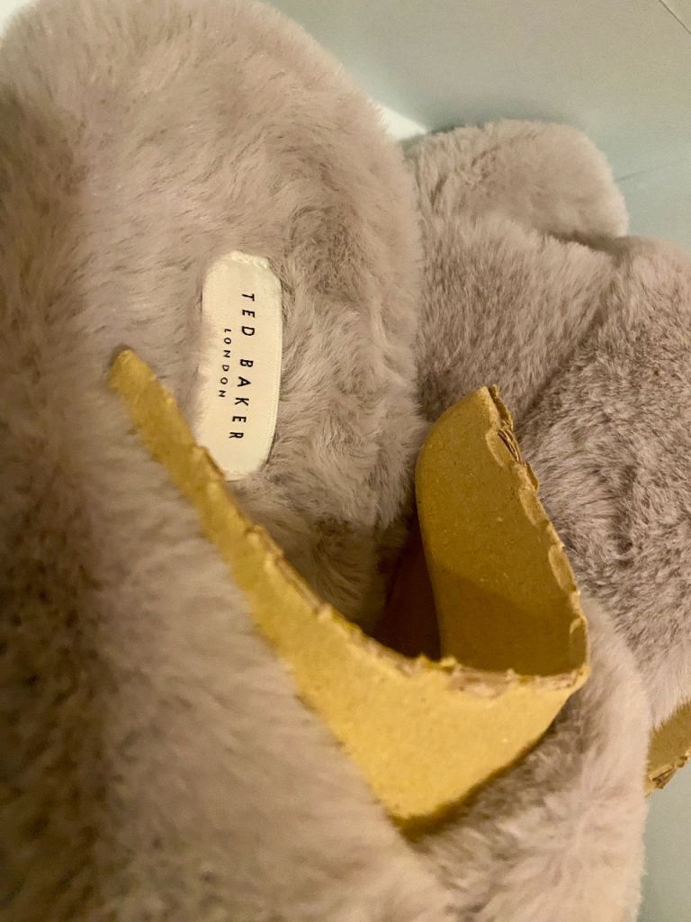 grey faux fur cross over slippers by Ted Baker in original box. European Size 38, British Size 5. original price on box.