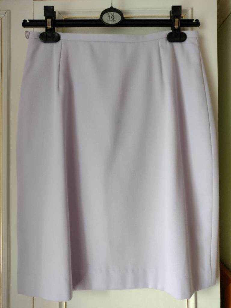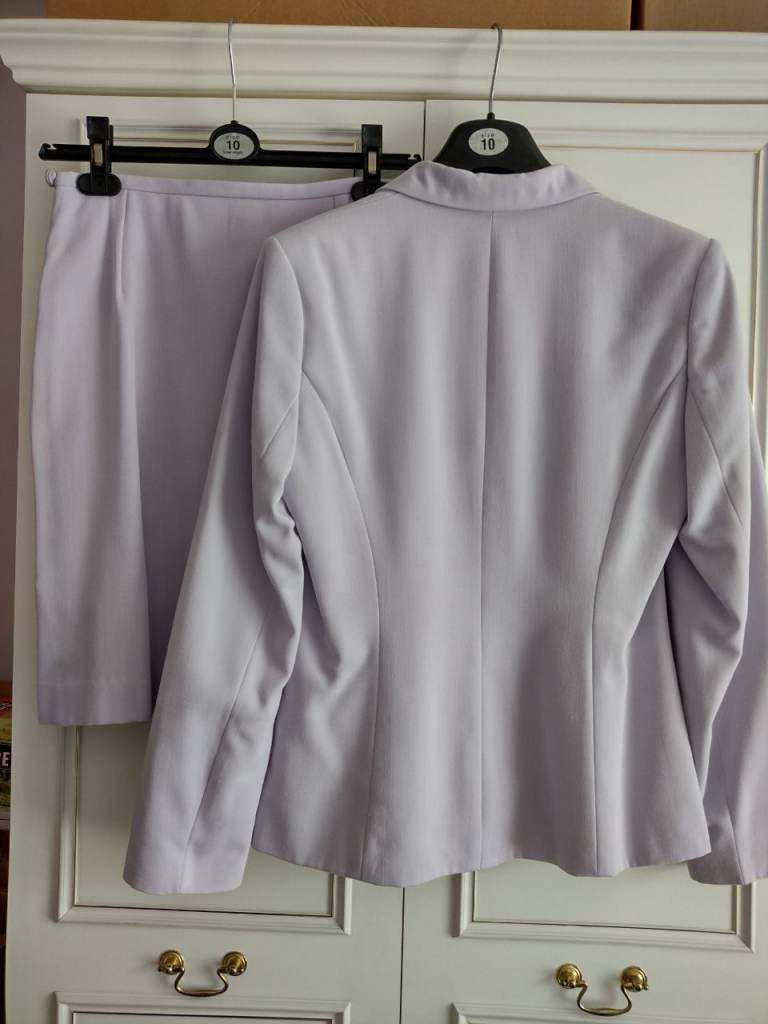 Size 10 Two Piece Pale Lilac Suit. With a fitted style Jacket & Skirt which is in a petite shorter length of 19.5 inches.