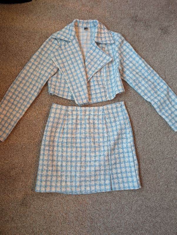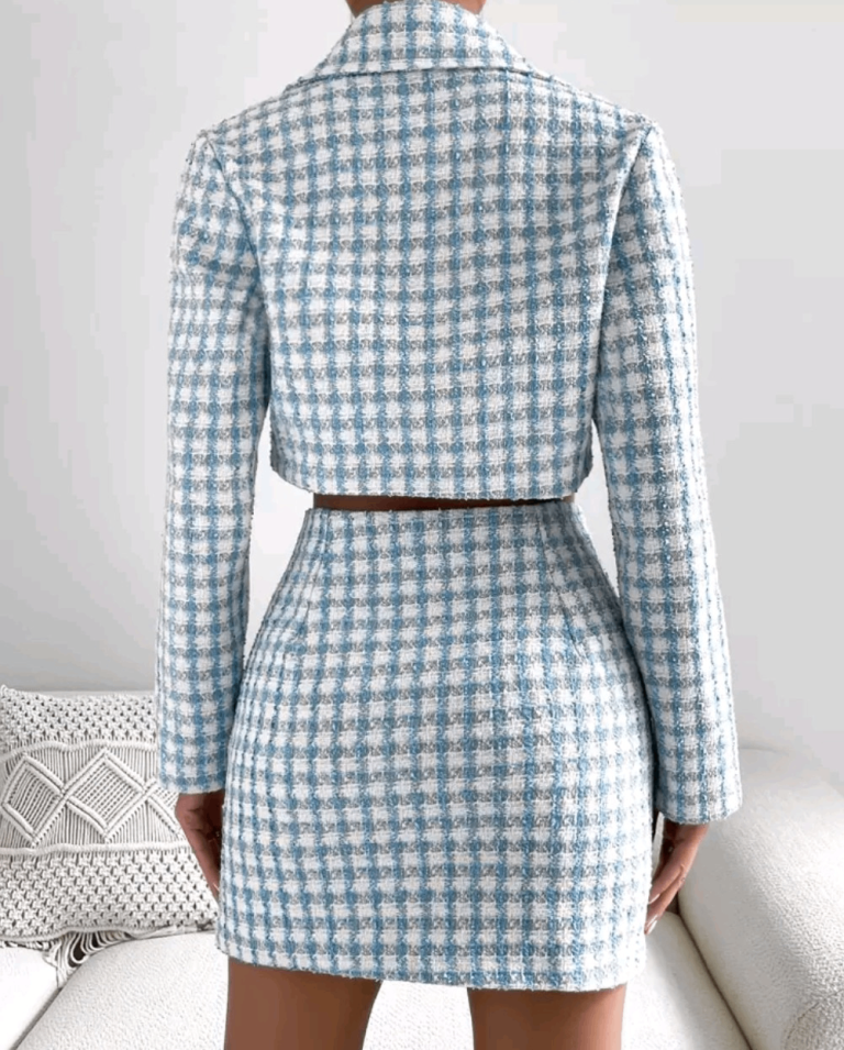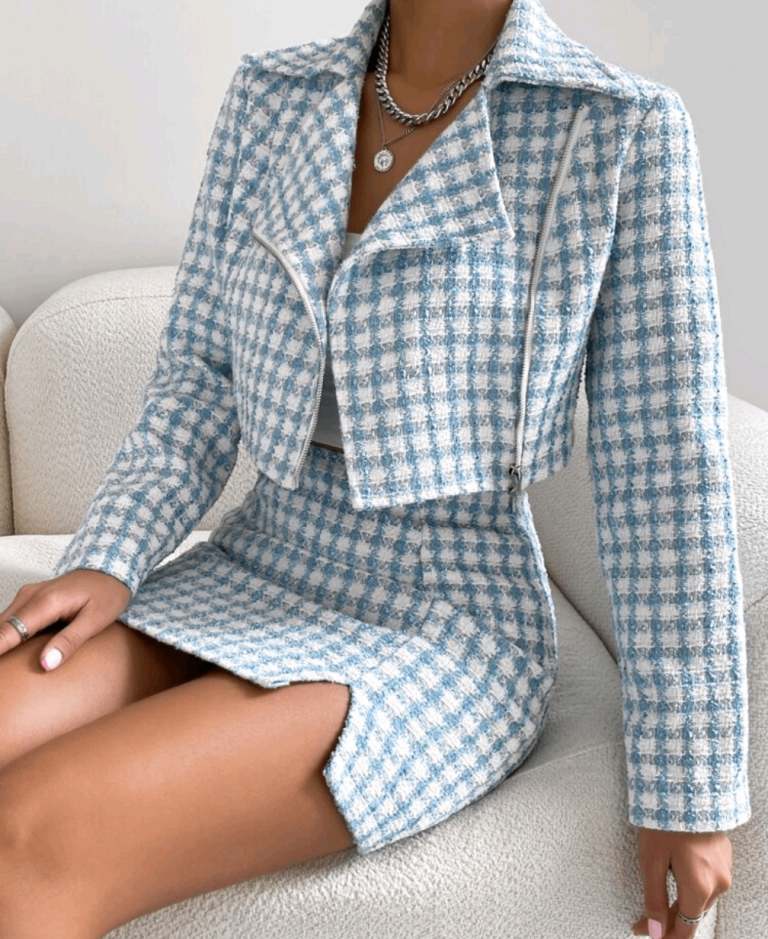 Shein Essnce plaid zip up crop tweed jacket & skirt set