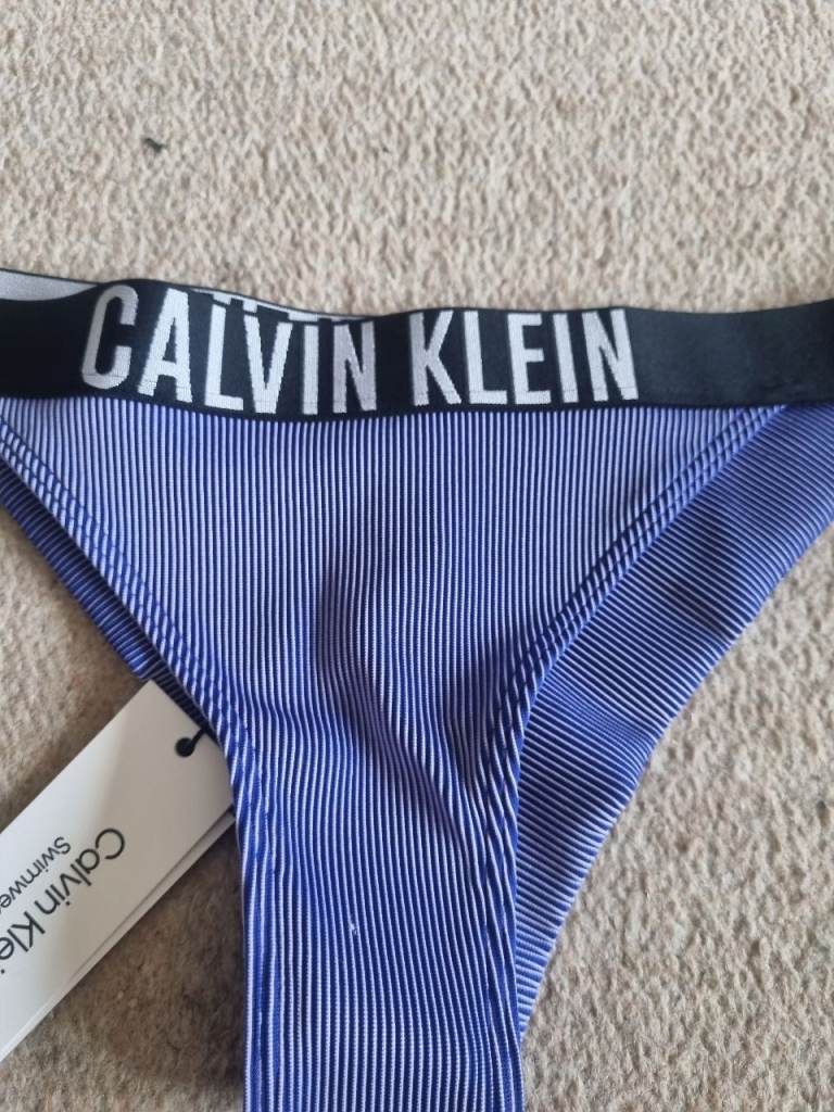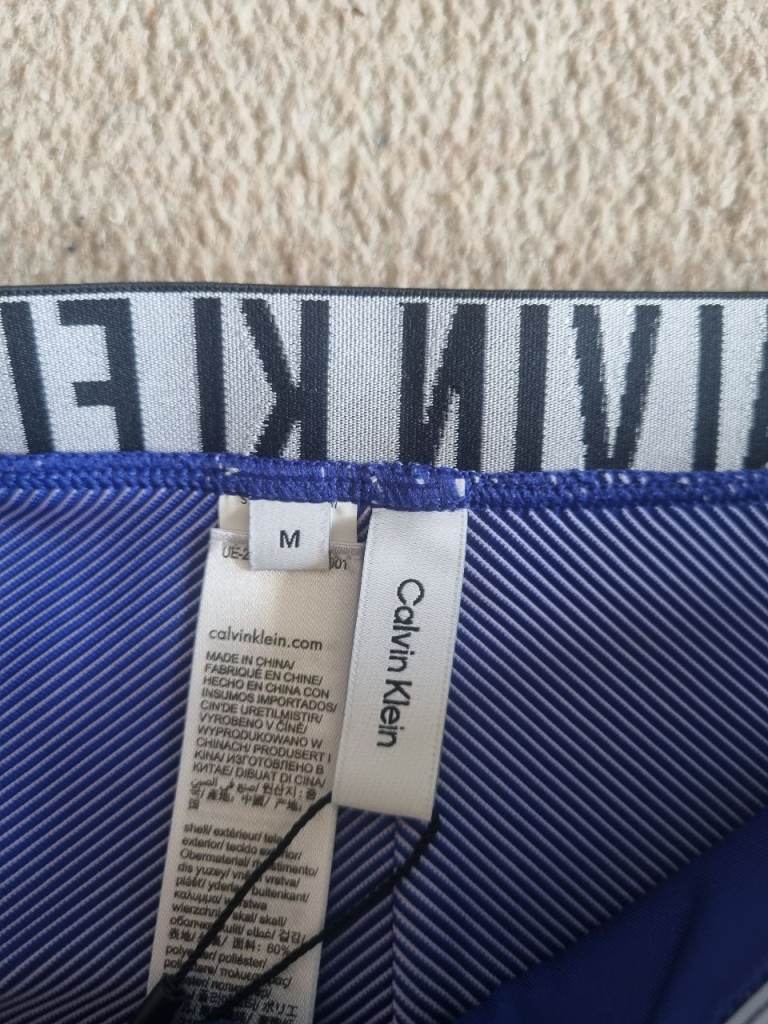 New Calvin Klein swimwear bottoms in blue with white pinstripes, still with original tags attached.