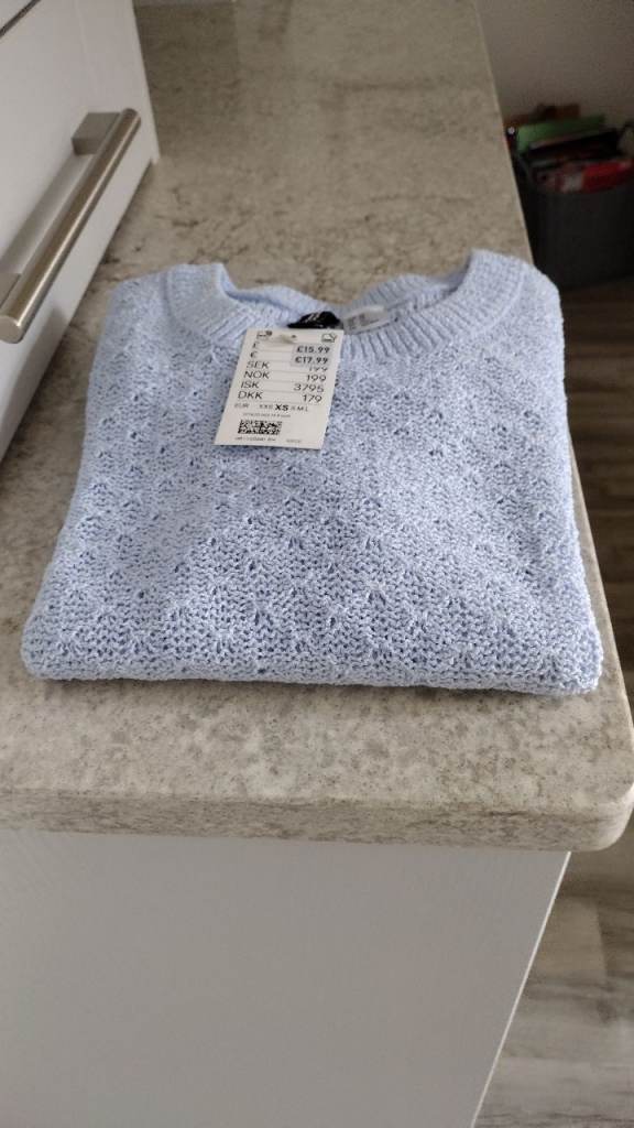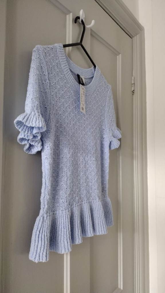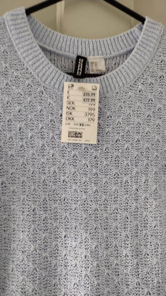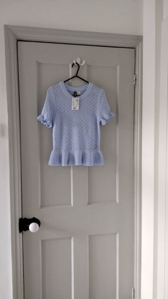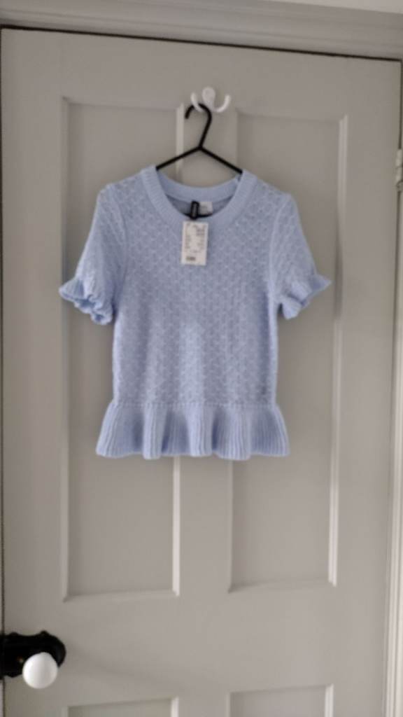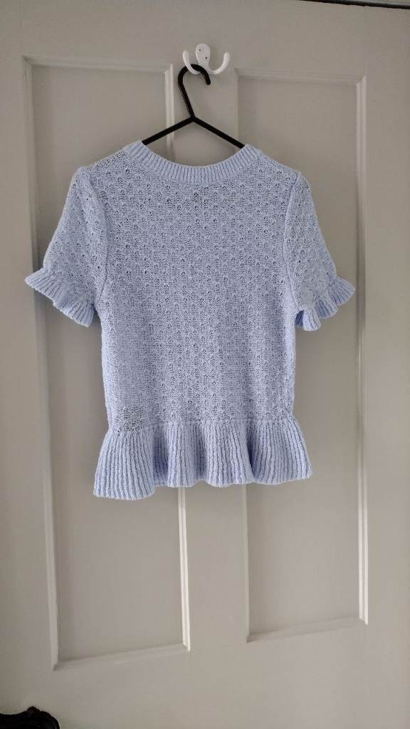 This brand new light blue knitted top from H&M has frill detail on the waist and sleeves. Size XS. 78% polyester, 22% cotton. Original label still attached. Price on label £15.99.