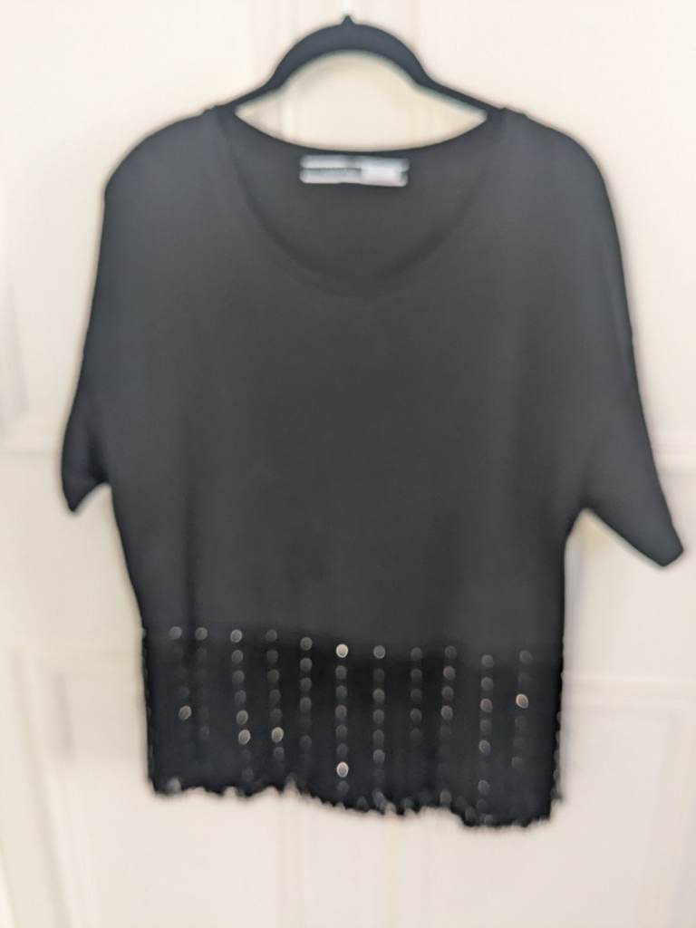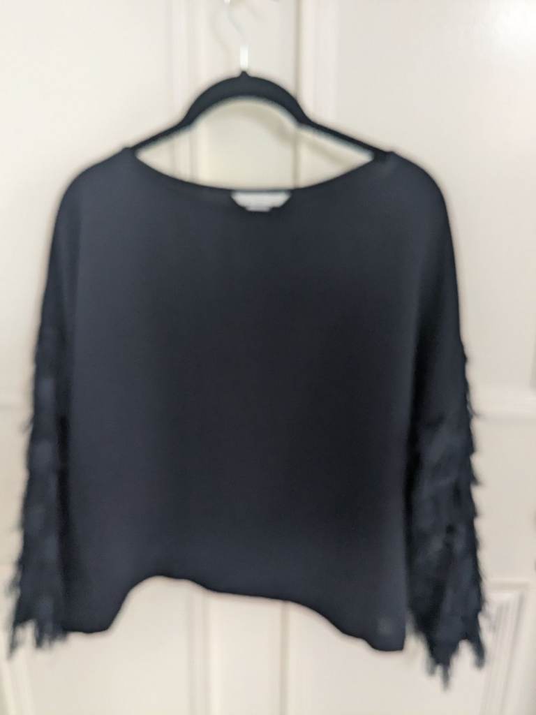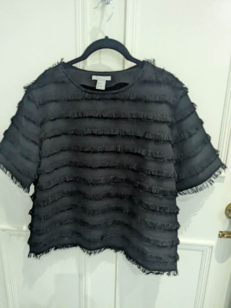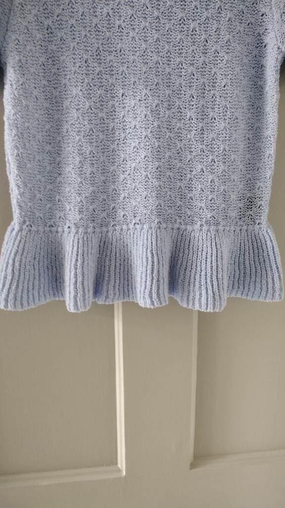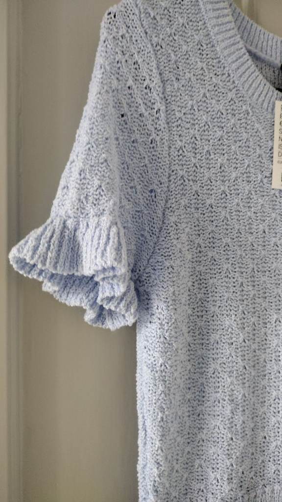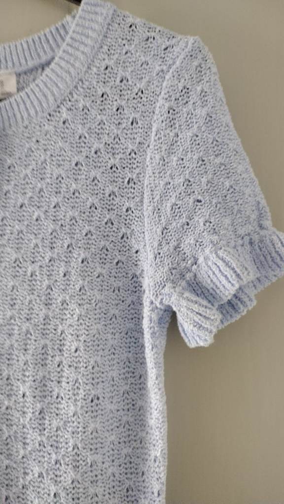 This brand new light blue knitted top from H&M has frill detail on the waist and sleeves. Size XS. 78% polyester, 22% cotton. Original label still attached. Price on label £15.99.