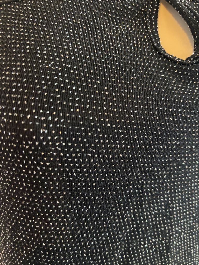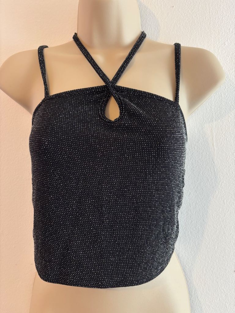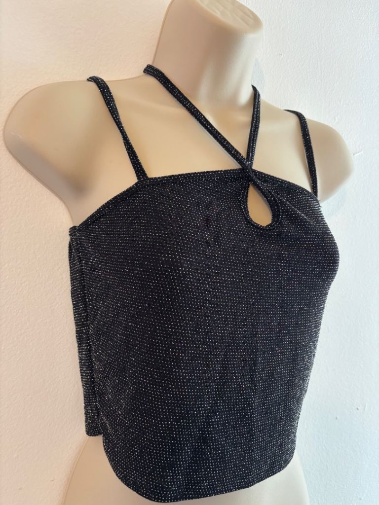 Black sparkly halter‑style crop top with shimmer detailing and a flattering cut‑out neckline. Eye‑catching, glam and perfect for statement outfits.