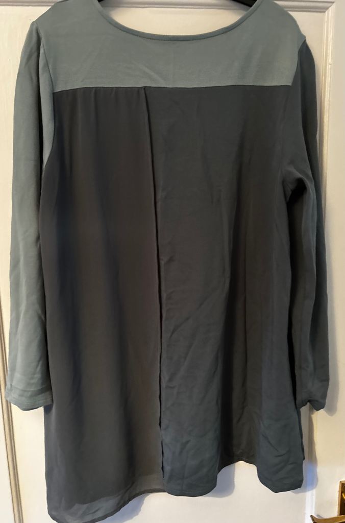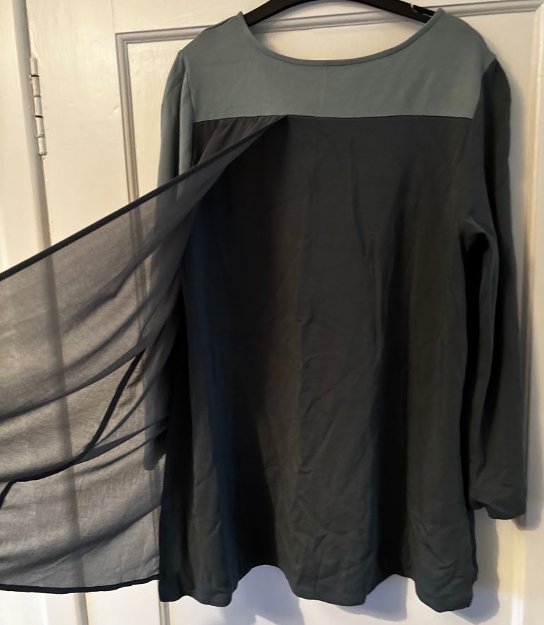 Features a layered design with a sheer overlay, very comfortable and flattering.