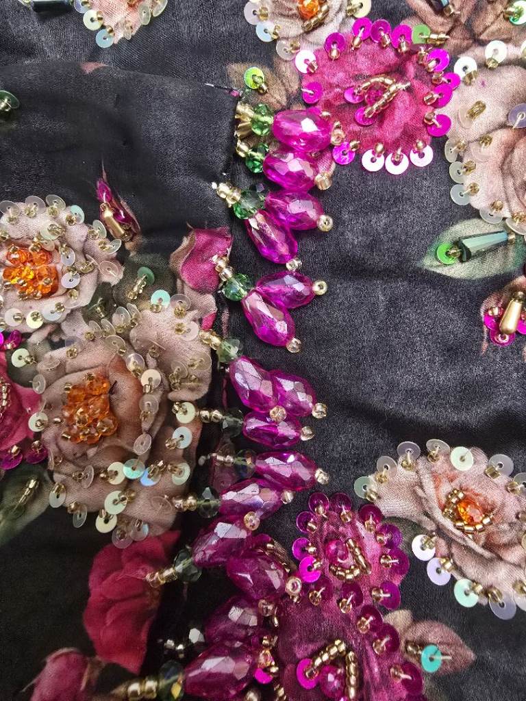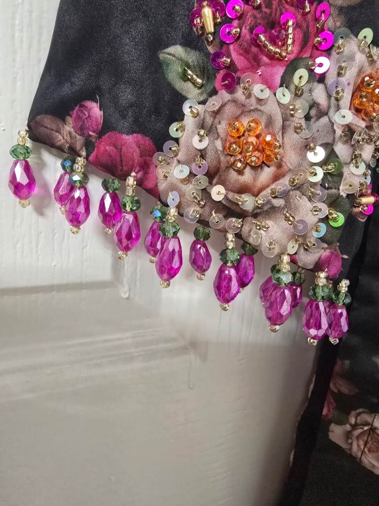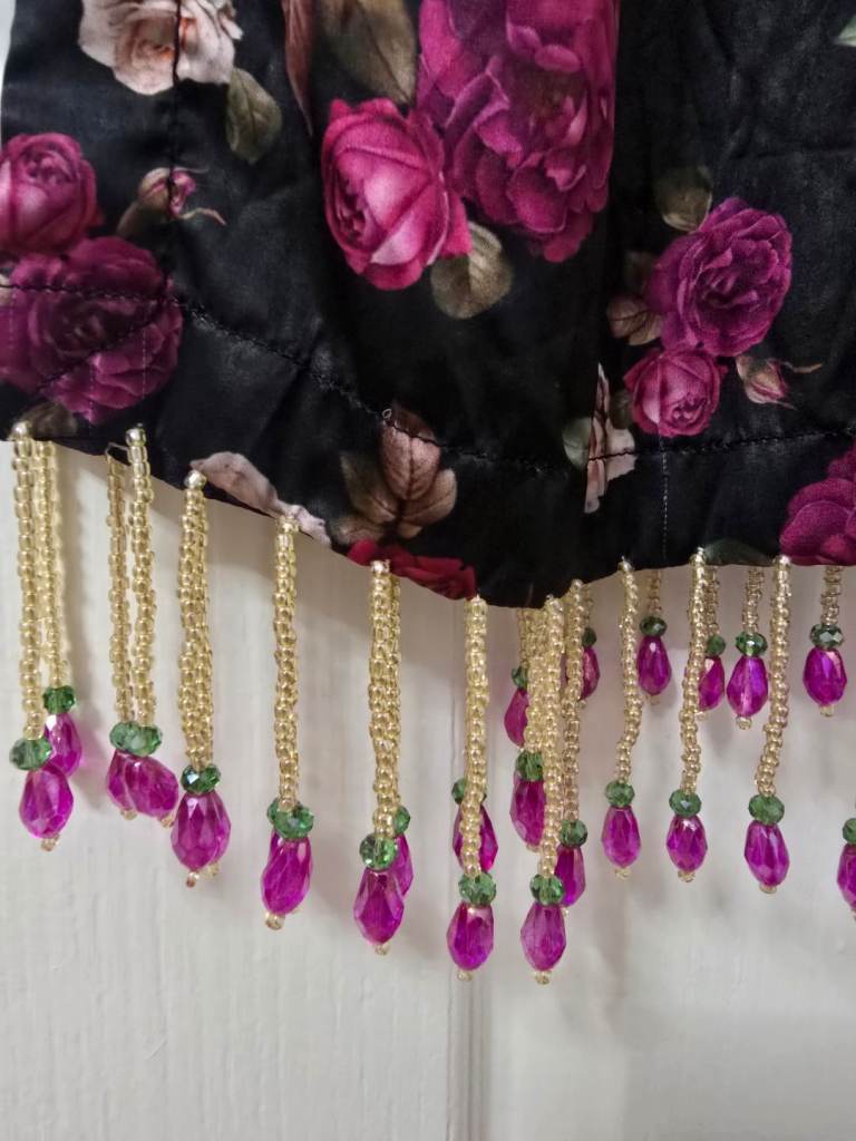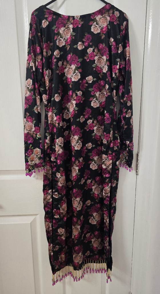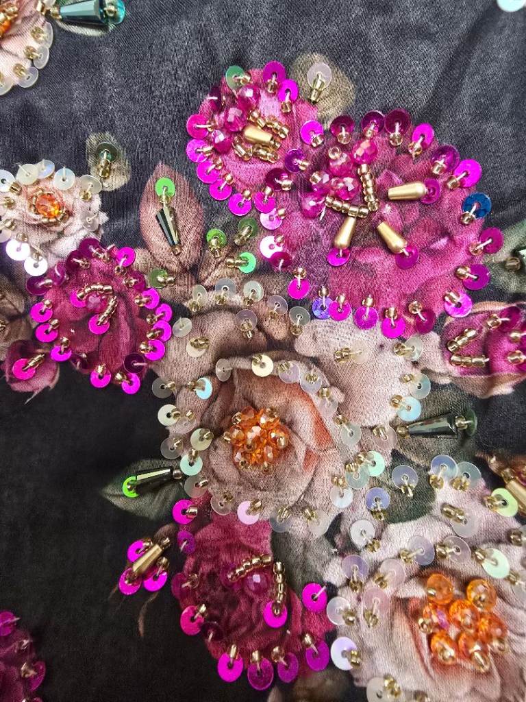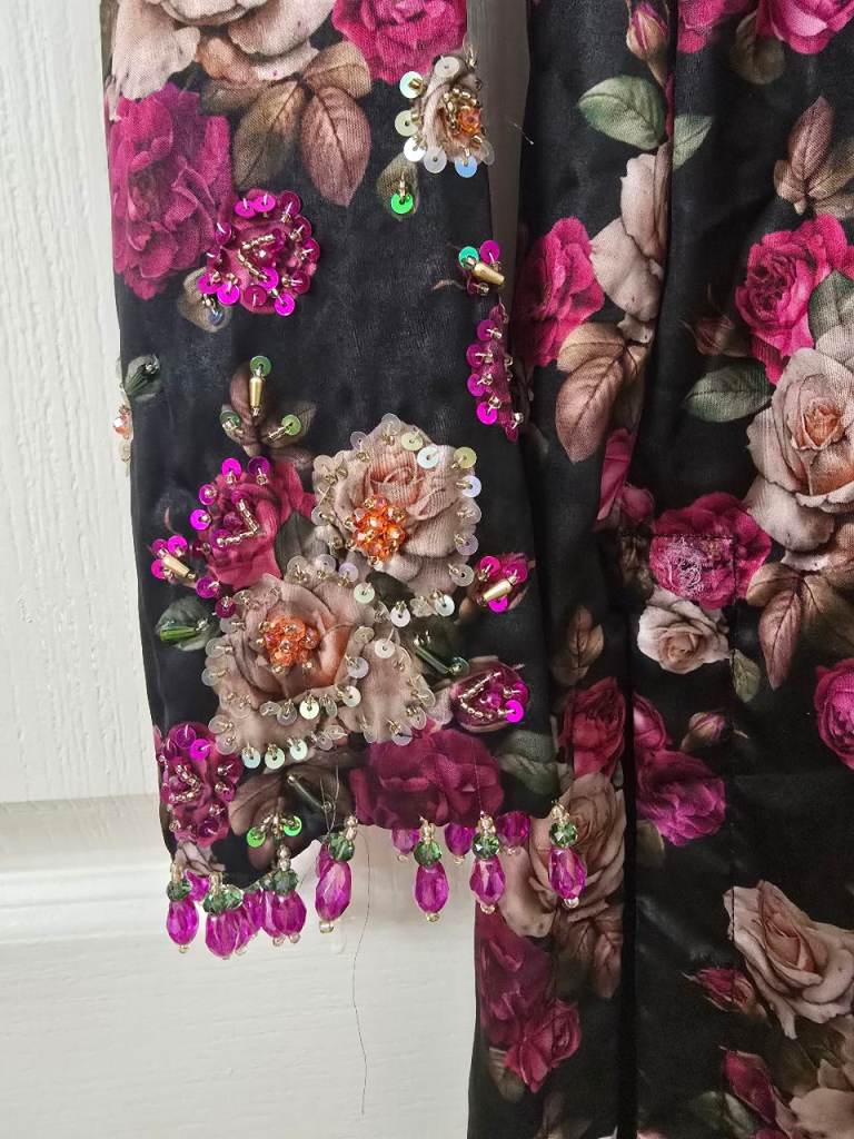 Gorgeous floral print all over the suit. Expensive and great quality beads on the sleeves, front and back of the kameez and dupatta. They are so pretty and shine in the light.