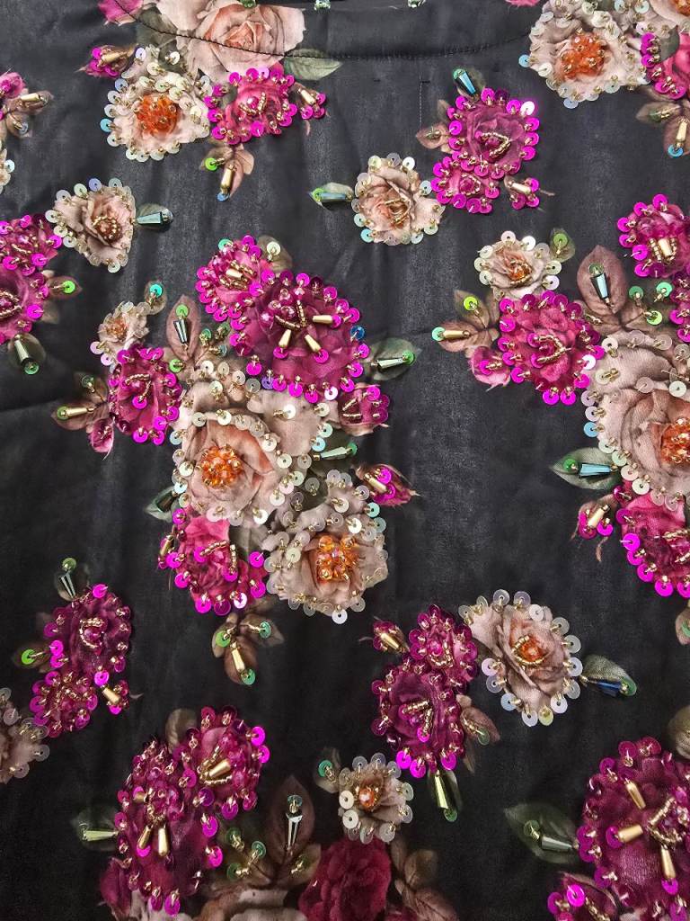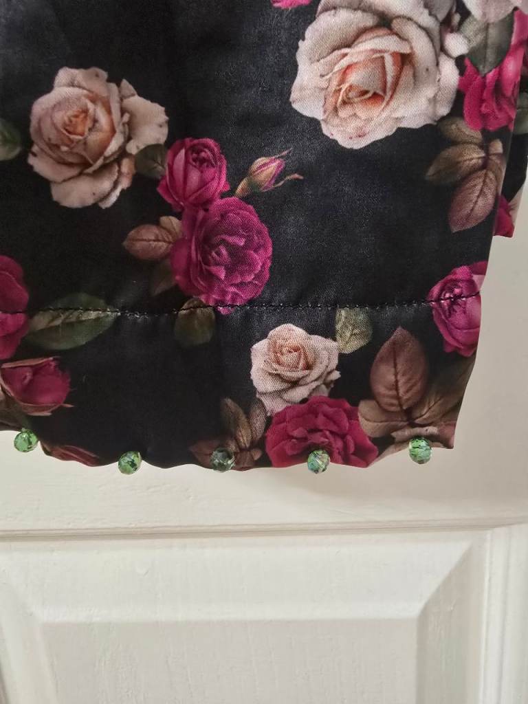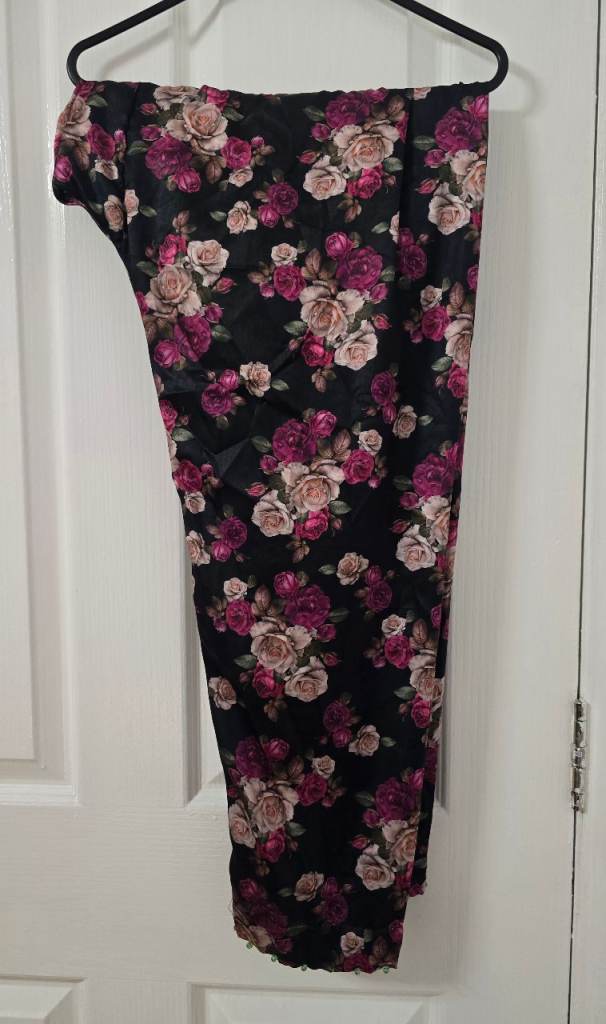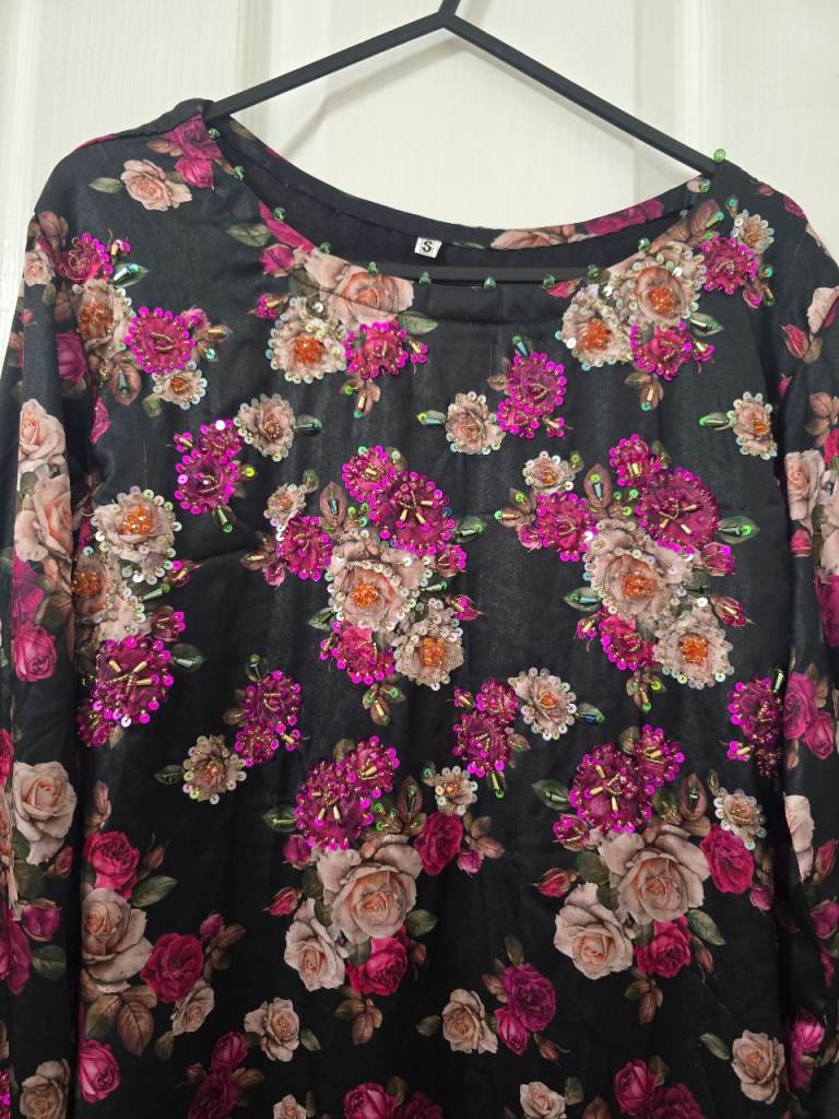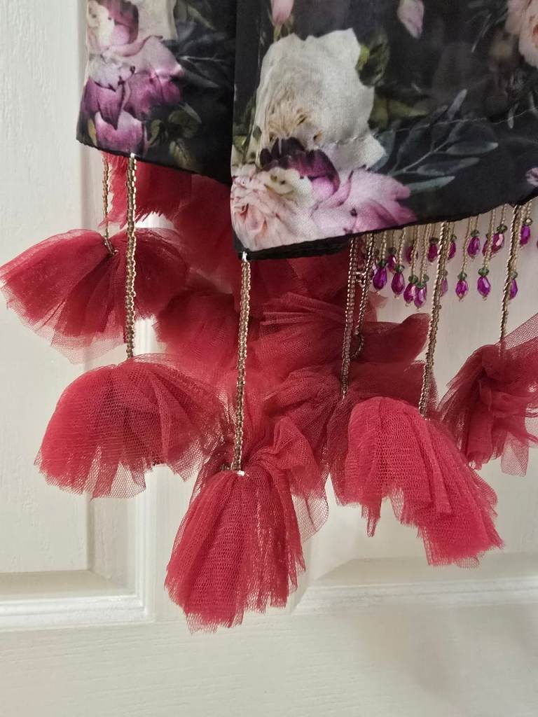 Gorgeous floral print all over the suit. Expensive and great quality beads on the sleeves, front and back of the kameez and dupatta. They are so pretty and shine in the light.