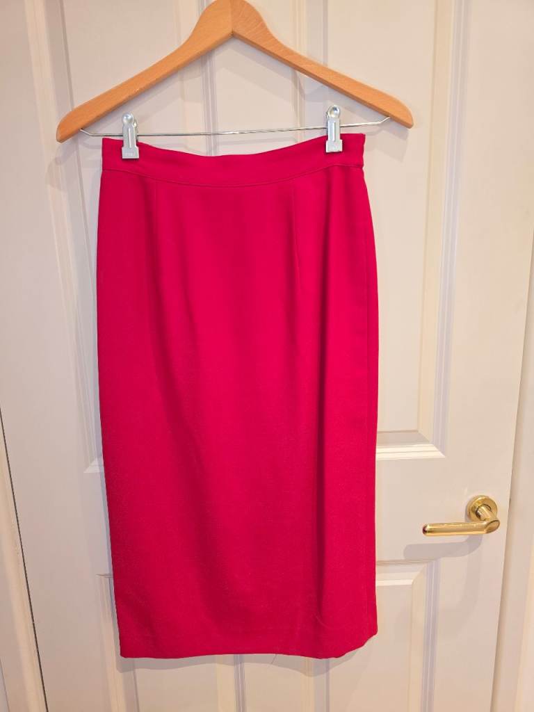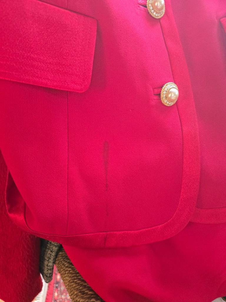 Versatile suit, jacket and skirt with silk trim around collar and cuffs. Very elegant. Downside has a dark stain (which can probably be removed) down front bottom right, hence very low price.