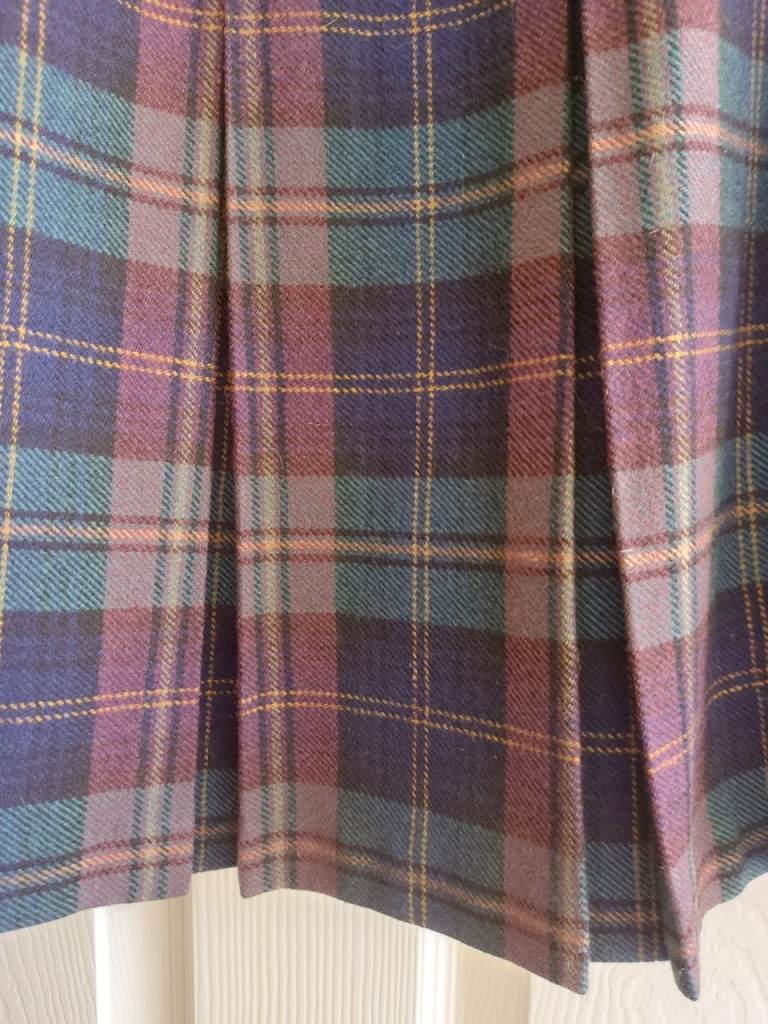 This vintage skirt was made by the famous Moffat woollens of Scotland. The pleats are box pleats .the tarten is burgundy and wine. The skirt is fully lined. Moffat in Scotland have now closed. Making these skirts much sought after and can sell for 3 figure sums. This is snip at a budget price snap it up quick before you are pipped at the post
