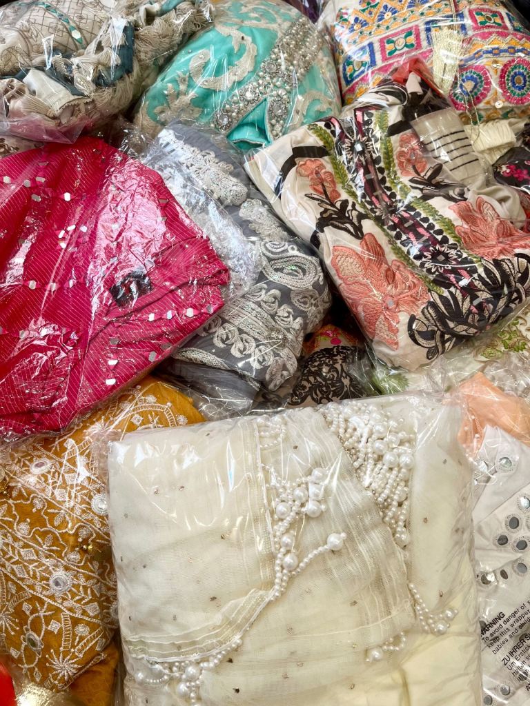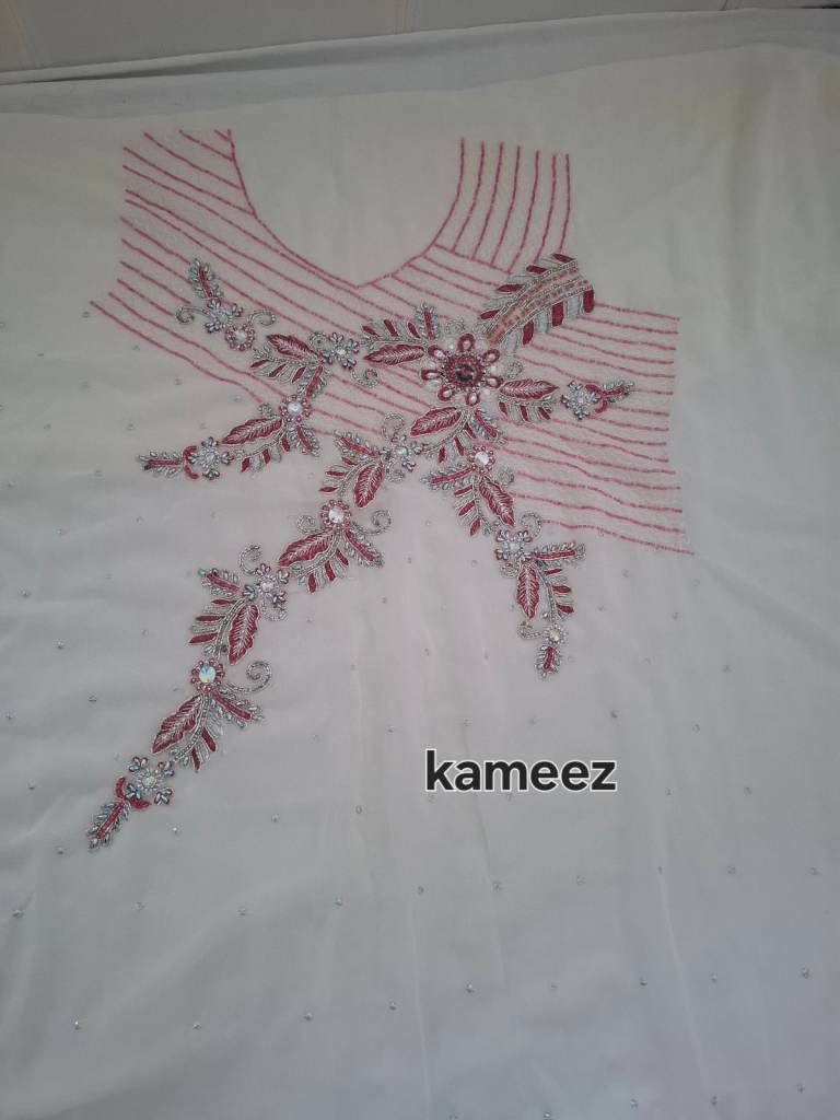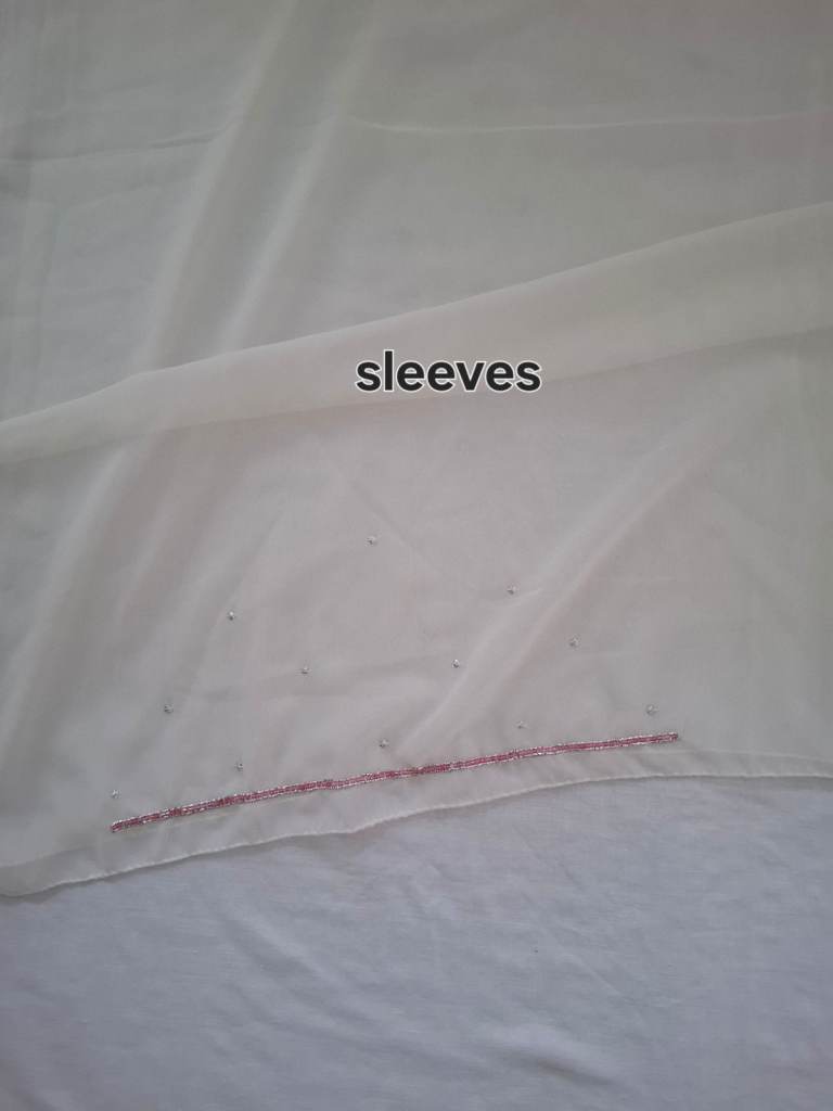 Unstiched 4 piece suit, kameez, salwar, two tone dupatta and lining. Pink and white