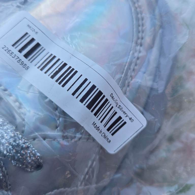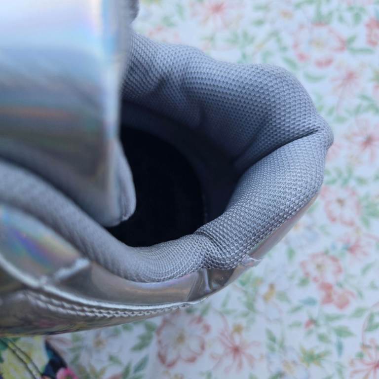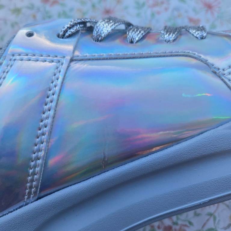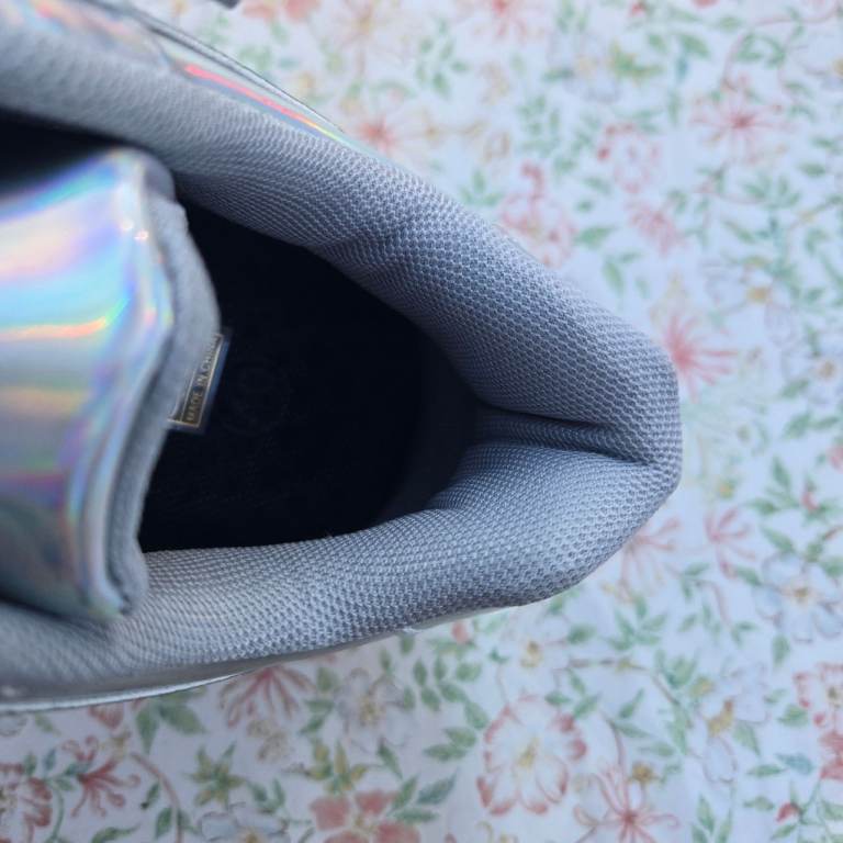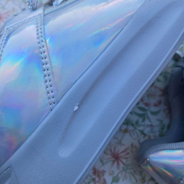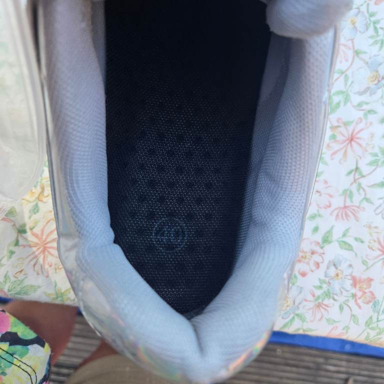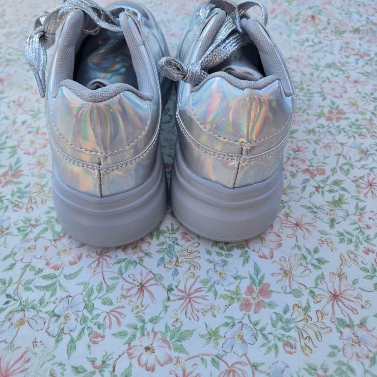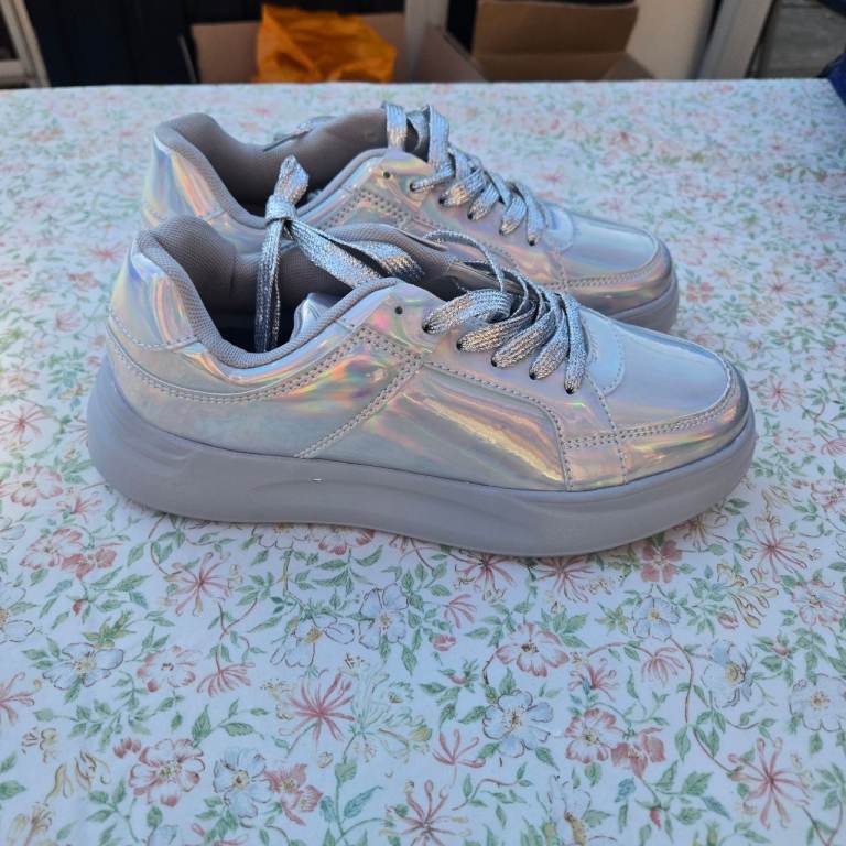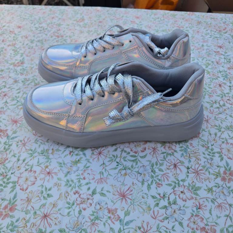 Brand new in packaging. Silver/grey holographic trainers. Has minor cosmetic defect as shown in photos. Very lightweight and comfortable. Slightly paded inner. Size China 40 uk size 6.5