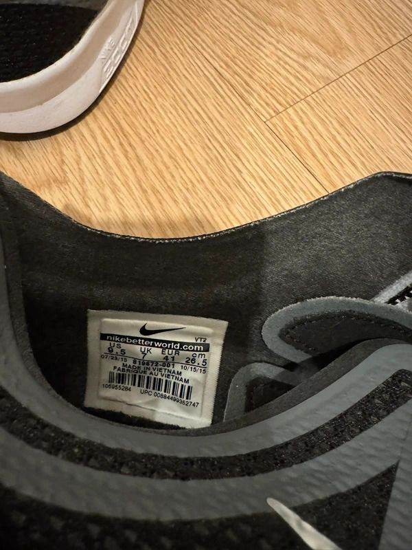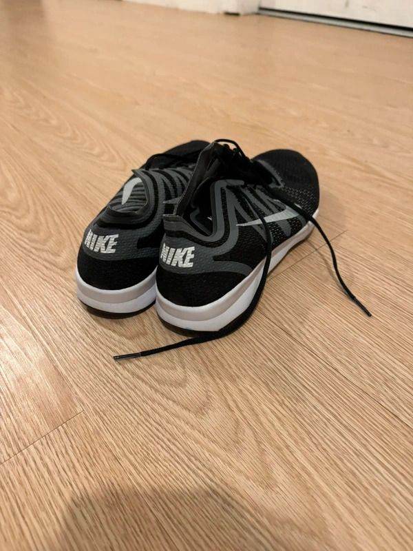 pair of black nike running trainers with breathable mesh uppers and white swoosh detailing. lightweight design with cushioned sole for everyday wear or workouts. used condition with general signs of wear as shown. labelled size uk 7 / eur 41 / us 9.5.