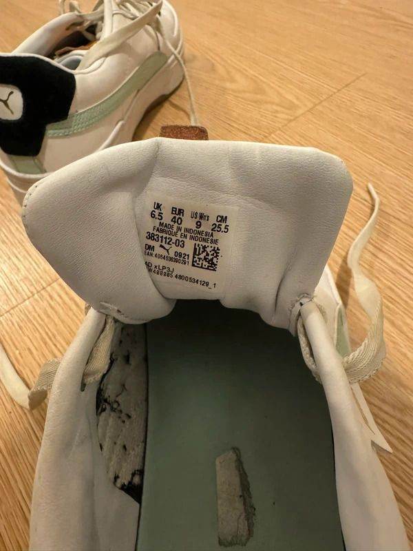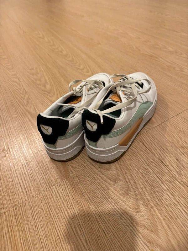 pair of puma trainers in white with mint green and black detailing. lace‑up style with chunky sole and gold puma branding on the heel. used condition with some creasing and wear to insoles as shown. labelled size uk 6.5 / eur 40 / us womens 9.