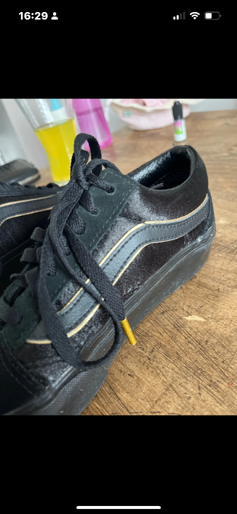 Ladies black Vans Old Skool trainers in suede, satin and leather with gold