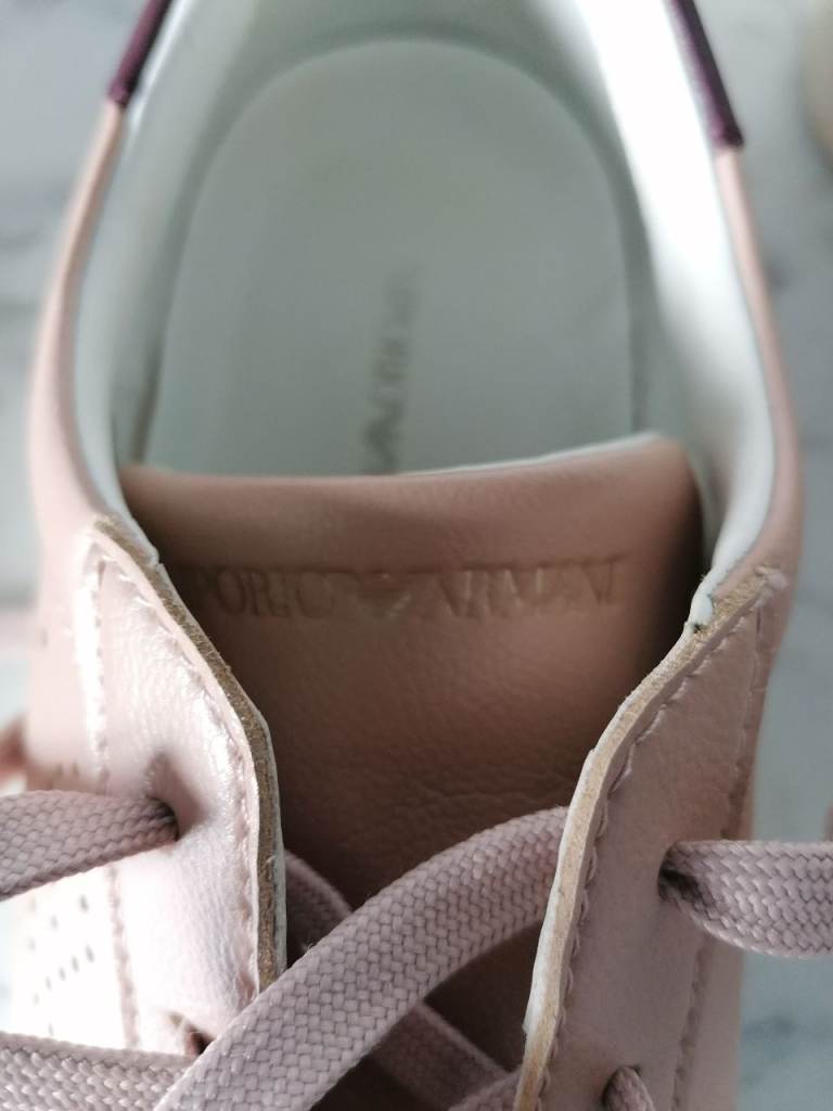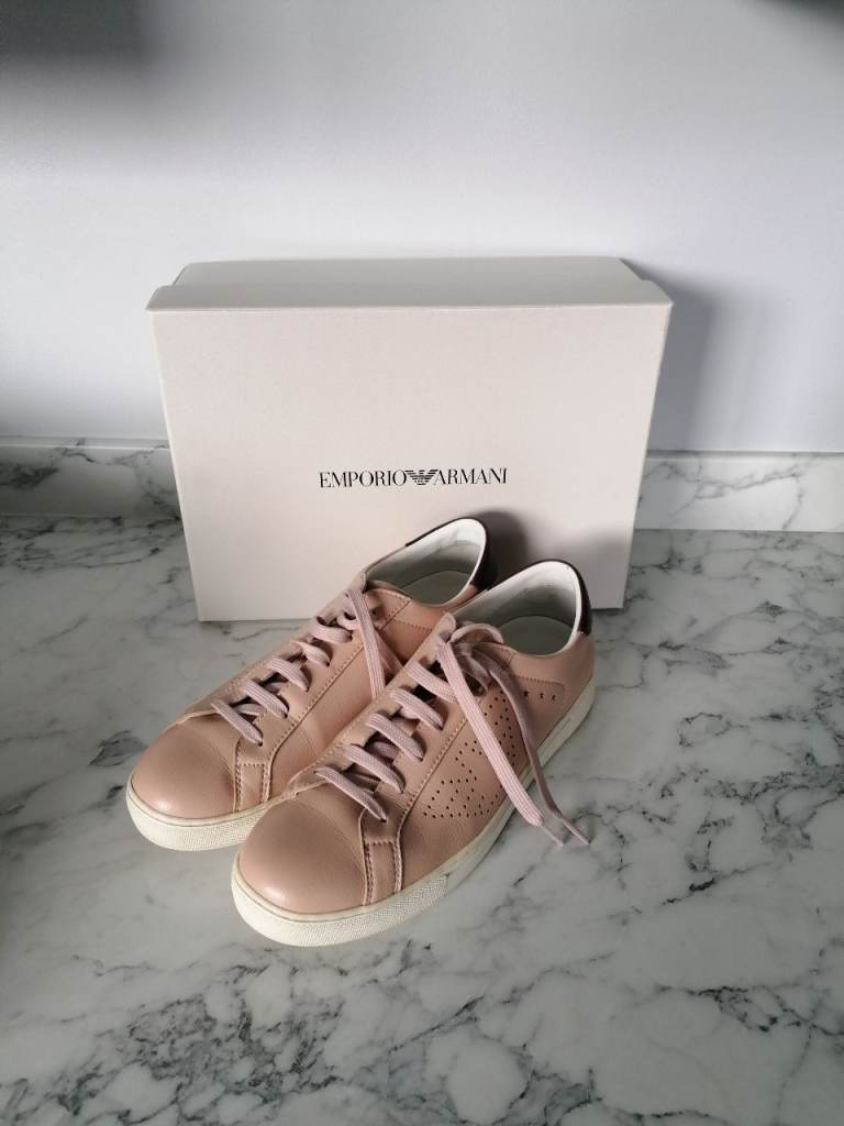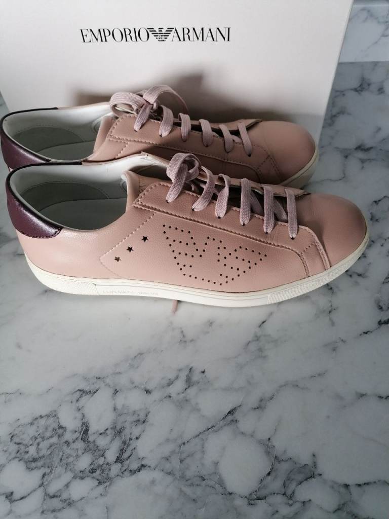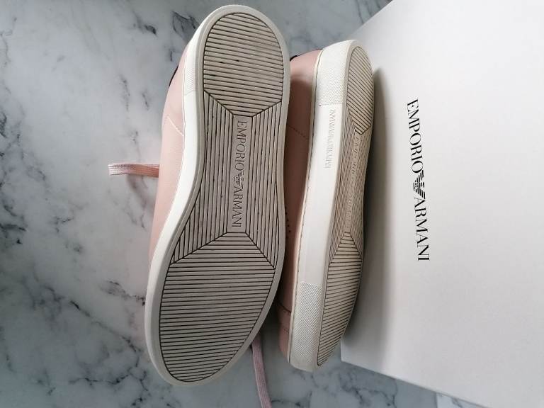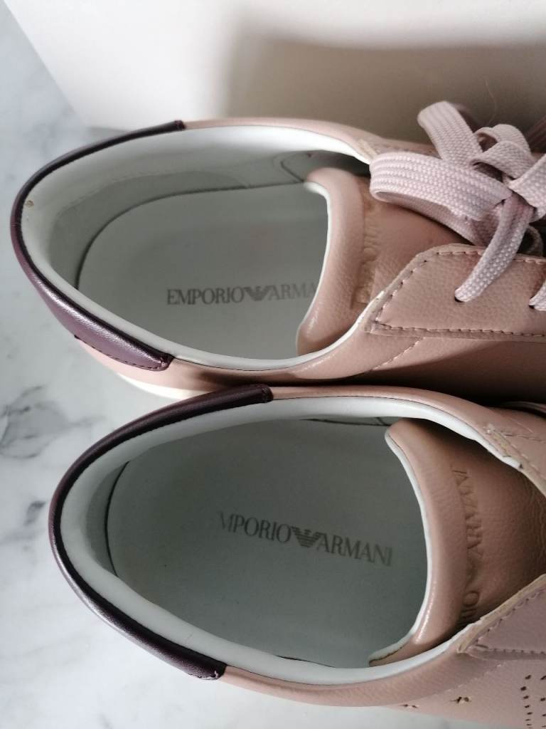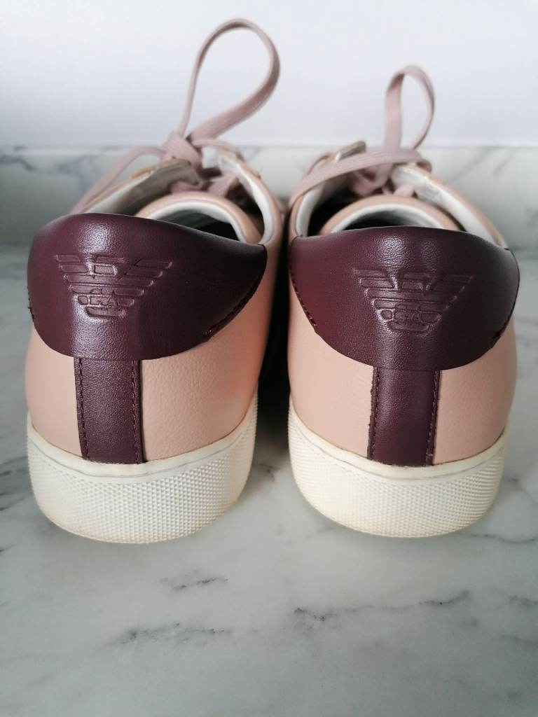 Emporio Armani faux leather women's trainers. Very good condition. In original box/packaging. Colour is pink/beige and burgundy trim. Buyer to collect from Hackbridge area. Cash only on collection please.