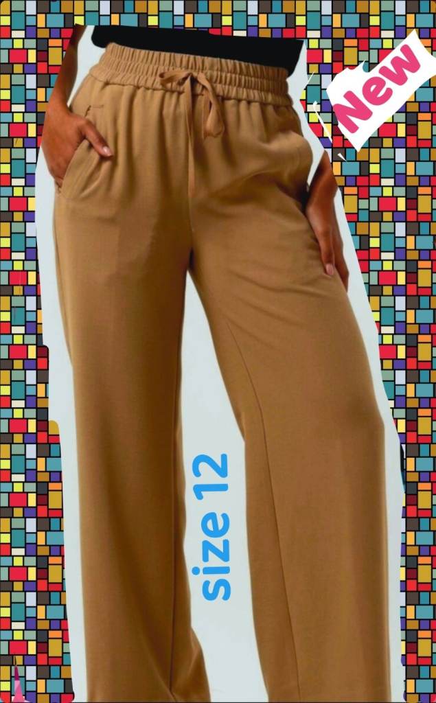 1x Ladies Nude Beige Cream Camel Elasticated Waist Drawstring Ties Wide Leg Palazzo Trousers Pants as shown and listed.