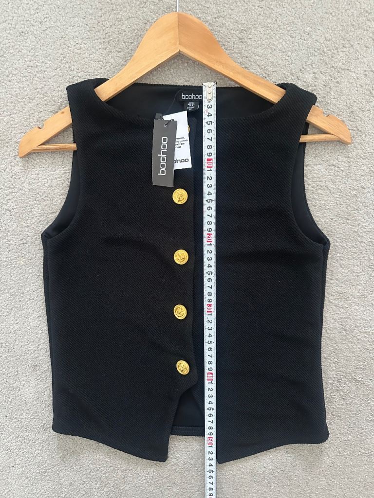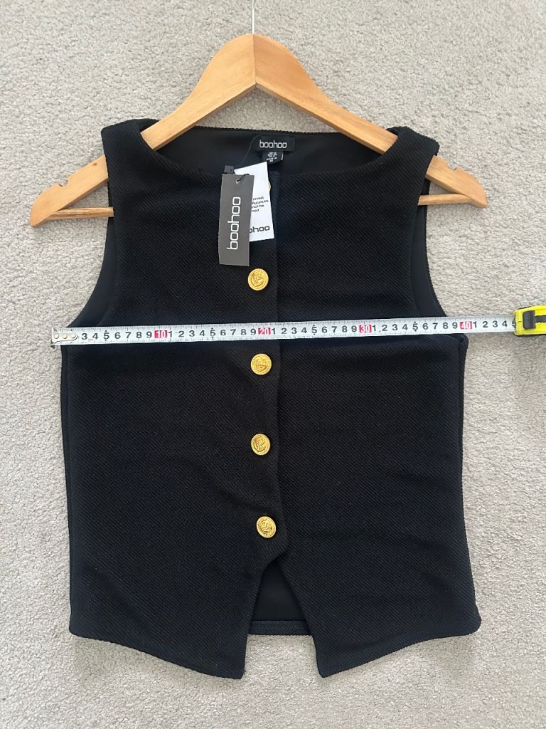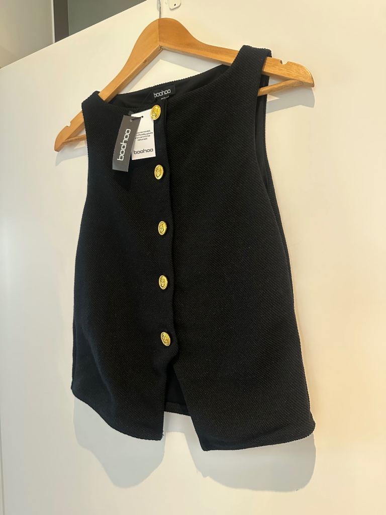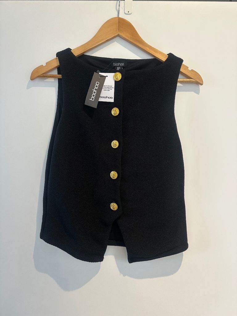 Stylish button-up vest top from Boohoo with decorative gold buttons. Labelled size 12, but runs small and fits more like UK 8–10 (S).