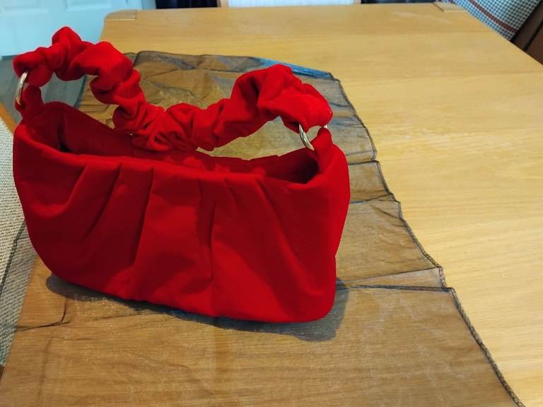 Red, multi-coloured bag with handles. The bag is fully lined in red fabric and has a zipped inner pocket. It has a zipped pocket on the front. The fabric is soft cotton with a firm base.