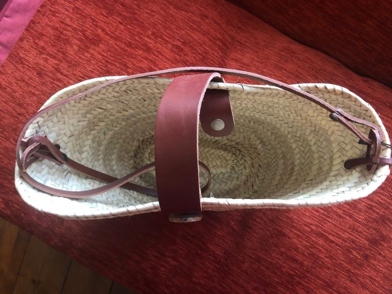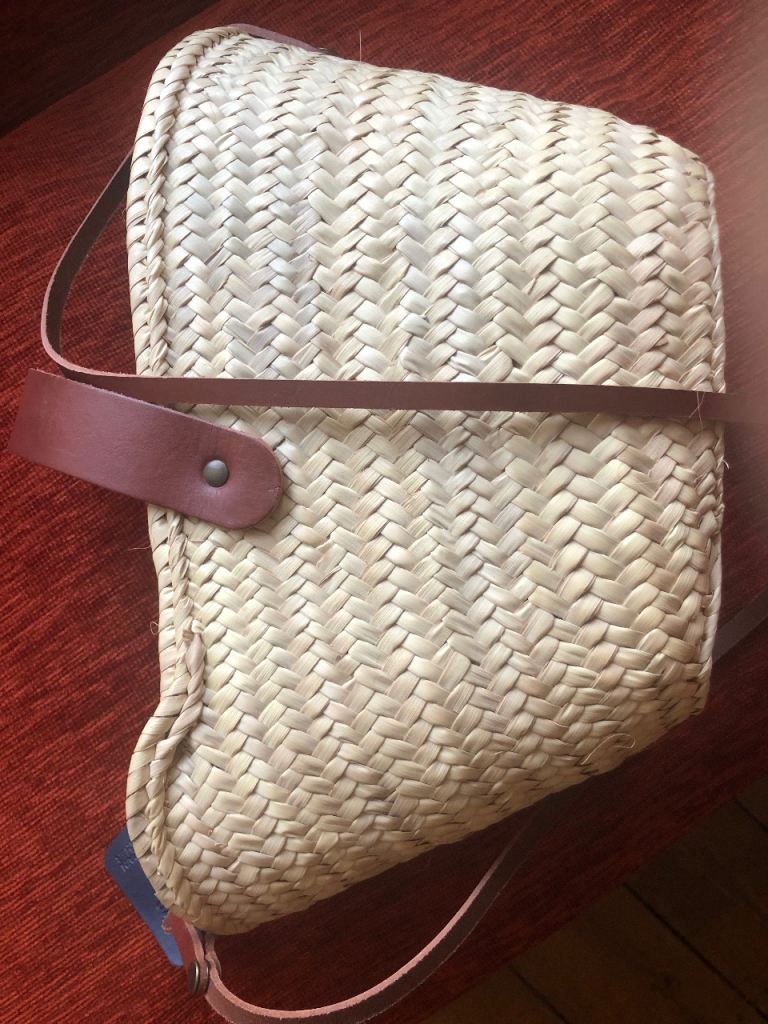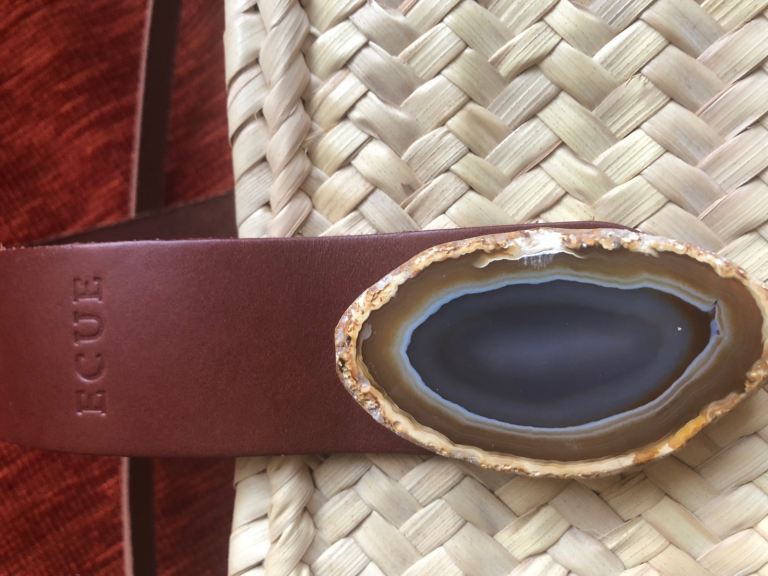 Spanish Ecue straw shoulder bag with decorative agate fastening clasp and leather shoulder and carrying handles.