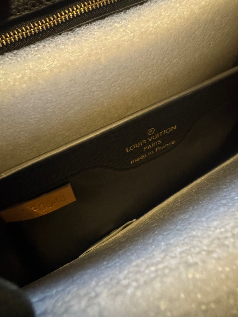 • Design Highlights: * LV Initials: The distinctive metal LV logo is partially inset into the leather at the top edge.
