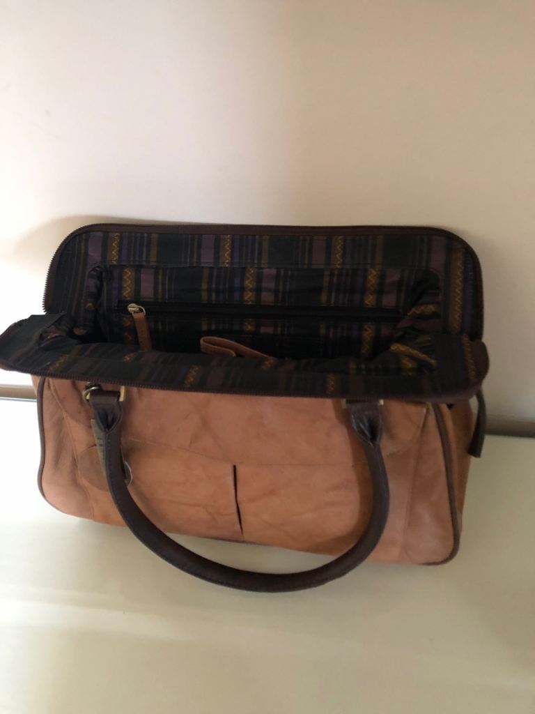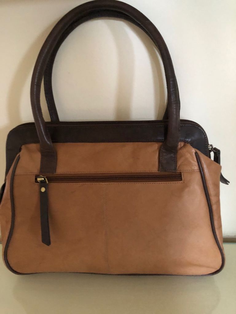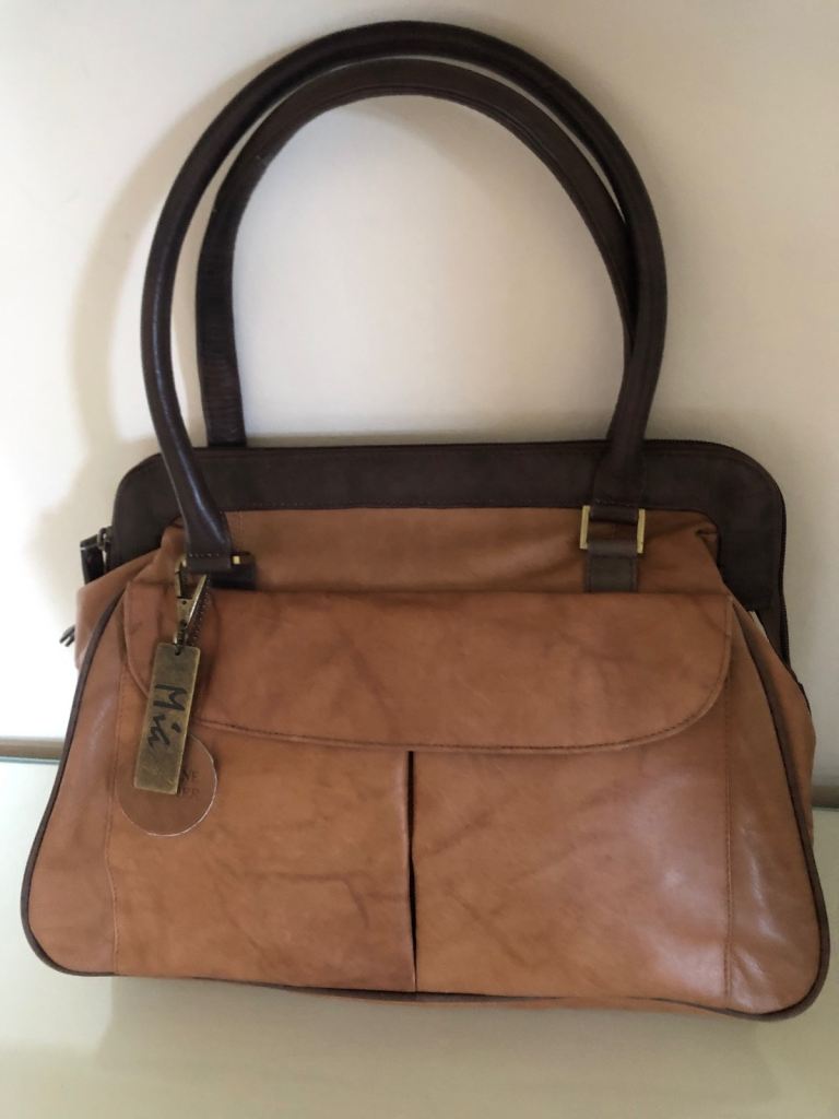 Soft leather tan & brown bag by Mia. Zipped across top, two front pockets and a zipped pocket on back. Hardly used gréât condition.