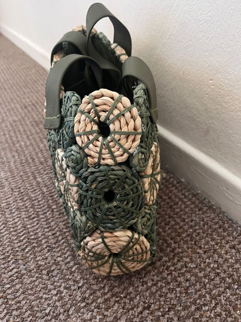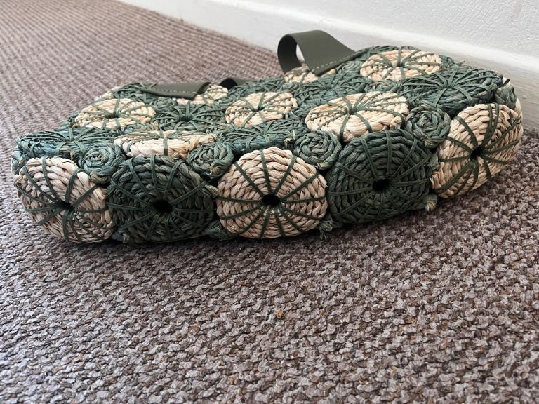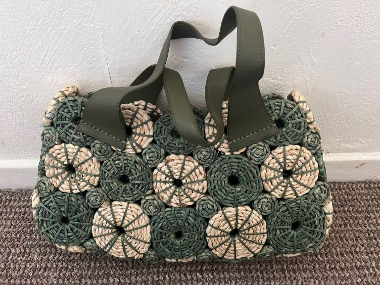 Design: A hand-woven summer tote made from straw/raffia material, characterized by its circular floral motifs and contrasting green faux leather or fabric straps
