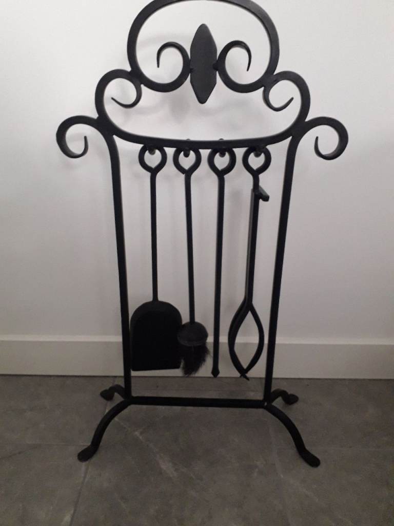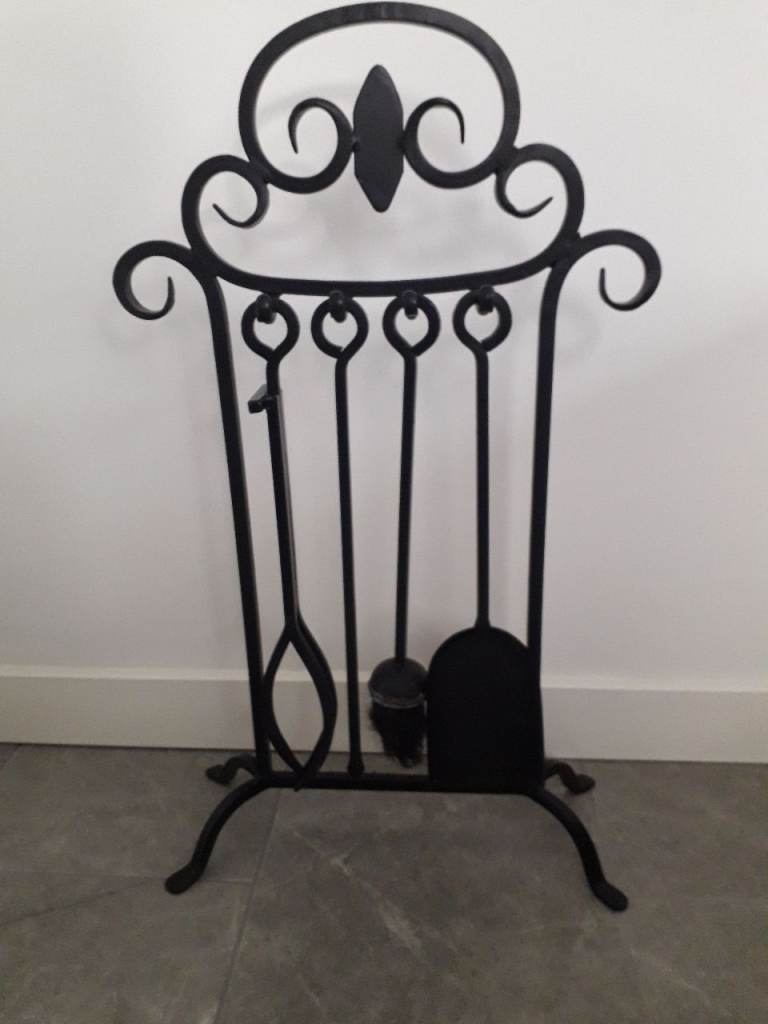 FIRESIDE SET INCLUDES LARGE TONGS, POKER, SHOVEL ASH BRUSH AND STAND. HEAVY CAST IRON TOP QUALITY FOUNDRY MADE WAS £75 WHEN NEW.