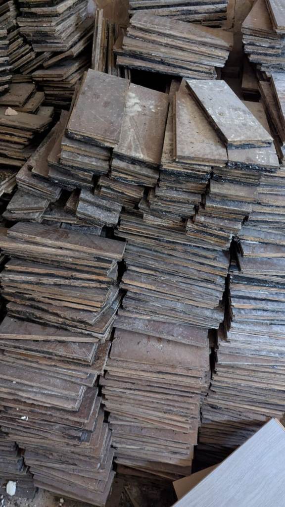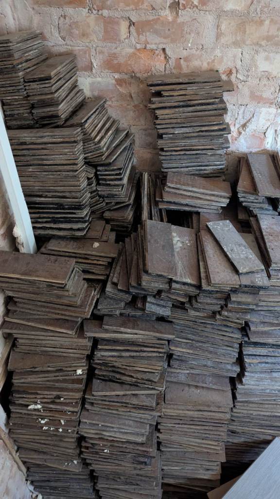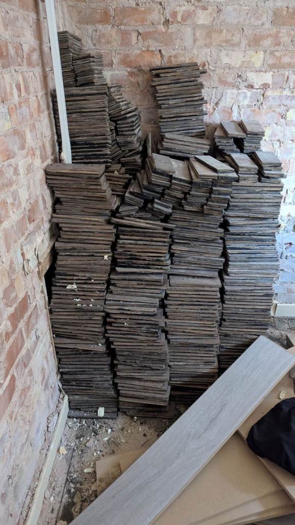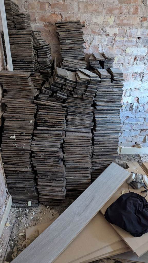 Parquet wood tiles available taken up from 2 bedrooms and lounge. Used but great condition as rooms were carpeted. Total cost for all is £300. Each one measures 23 cm x 8 cm x 1.5 cm