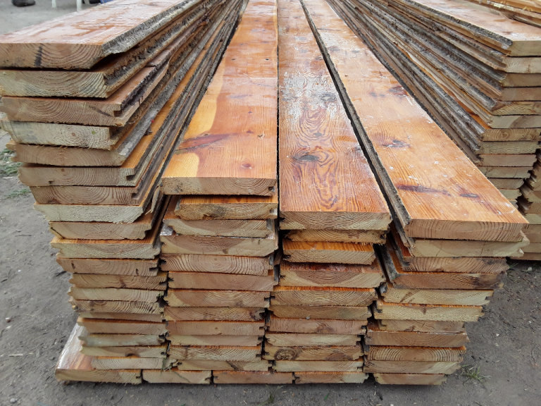 Reclaimed pine floorboards, width up to 6.4 inch. 30 mm thick. Length up to 16 foot.