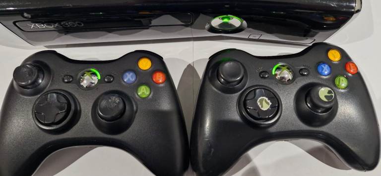 Xbox 360 slim good condition with quite a few craze and scratch marks due to the age of the console and comes with two matching black controllors & 3 games.