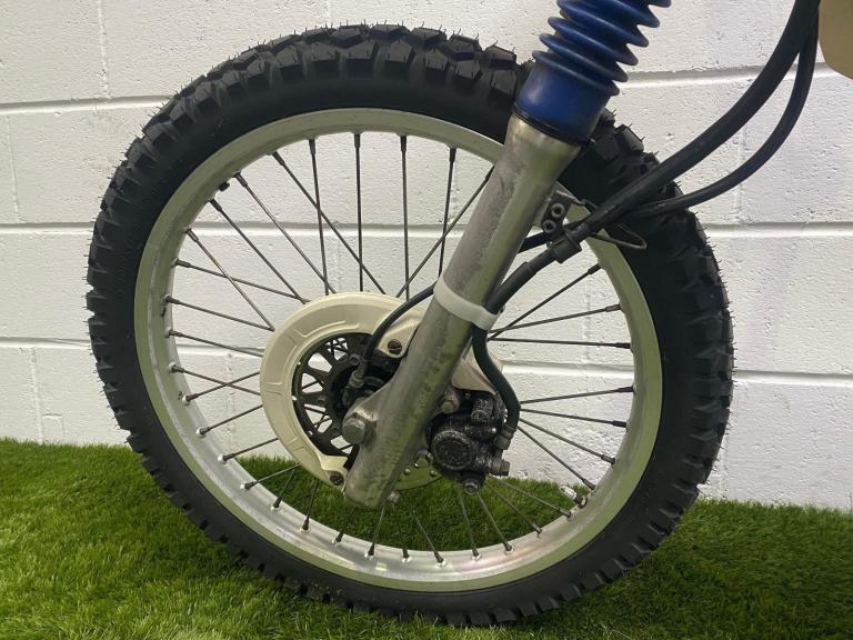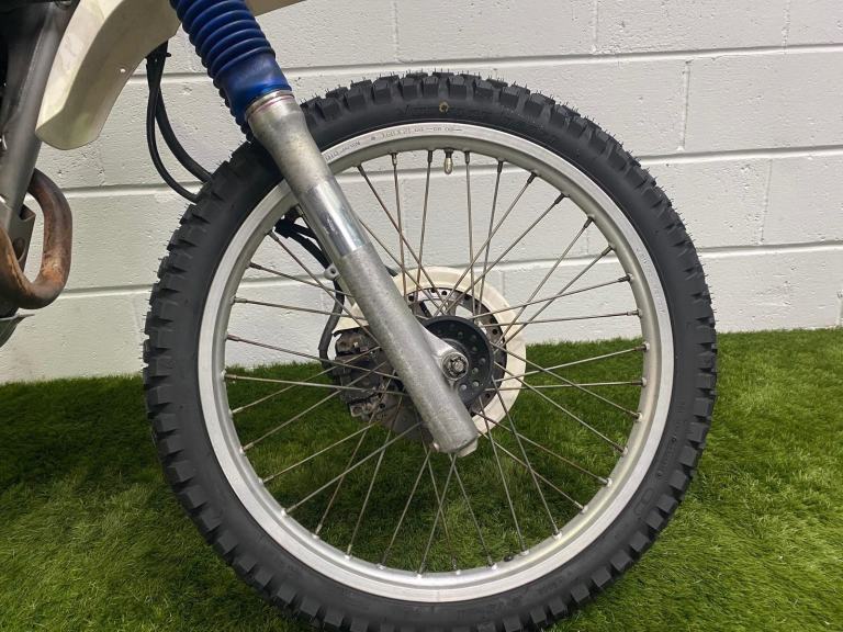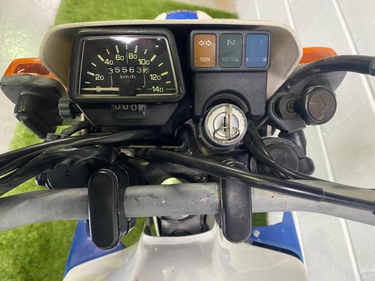 This is a really nice example of an early Serow 225. The Serow is a low seated, slim enduro, famous for being rugged, fun and versatile. Ours is in blue and white with silver graffito graphics. It has knuckle guards, a front disc brake guard, rear rack, tool box and a chrome muffler guard. It is both electric start and kick start and has been fitted with new tyres. There is some ageing on the lower forks and the gaiters look a bit gummed up but the overall condition is excellent.